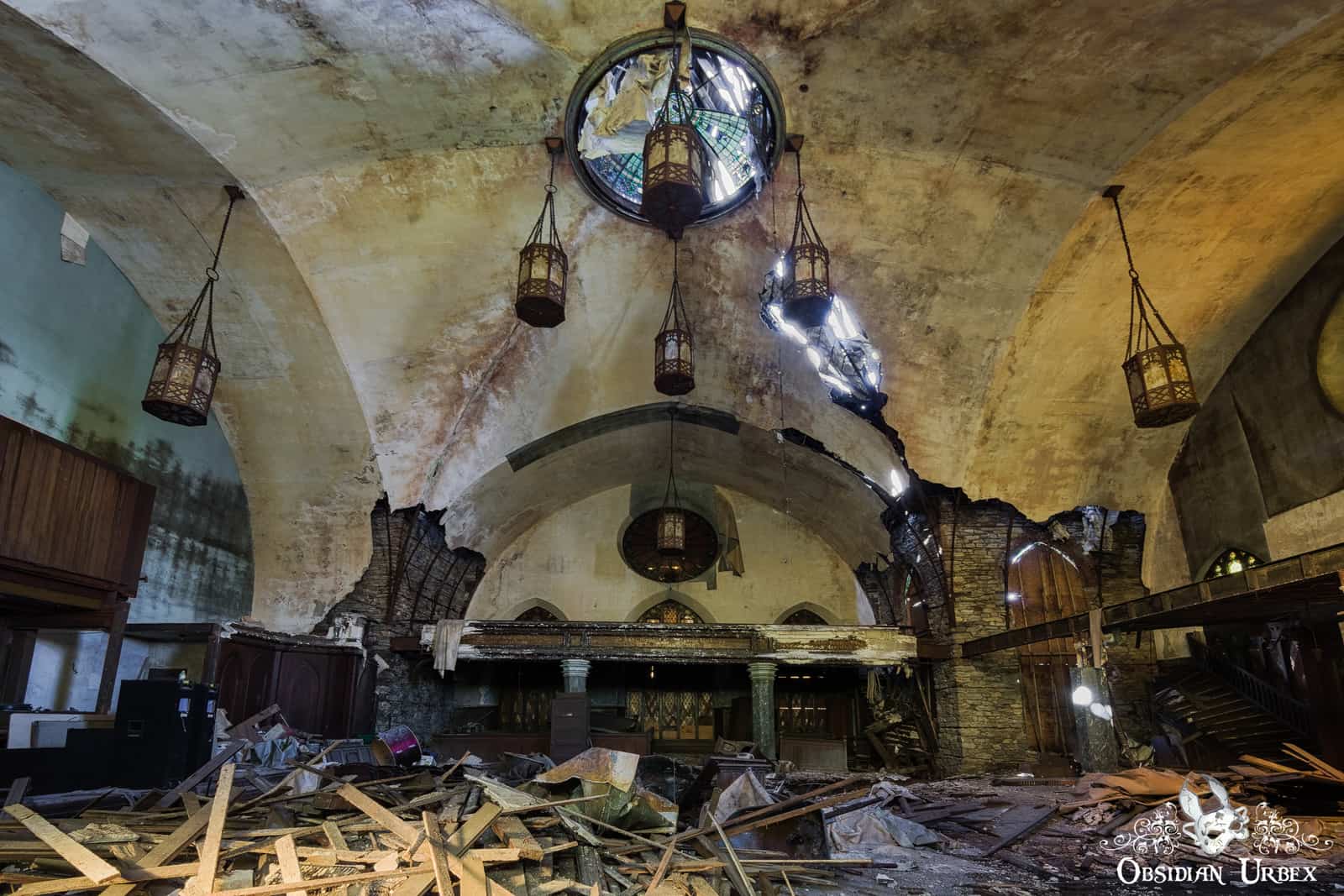 Nowadays the church is filled with pigeons, and piles of rubble and rubbish scattered everywhere. The stairs and floor are collapsing in several areas. A lot of the windows have been smashed, and boarded up in a slap-dashed fashion.