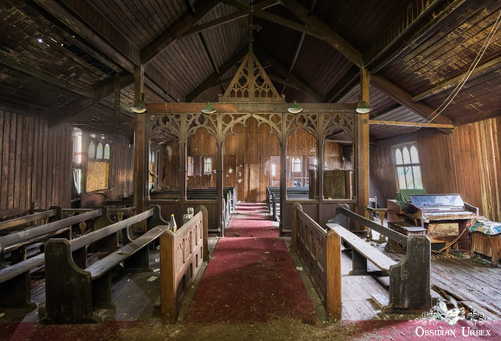 The Iron Church still has wooden furniture, including most of the pews and the pulpit. There are also three mini church organs, all huddle together near the pulpit. The windows are dirty and covered with cobwebs. Some vegetation grows inside, ferns and ivy in different areas of the crumbling church.