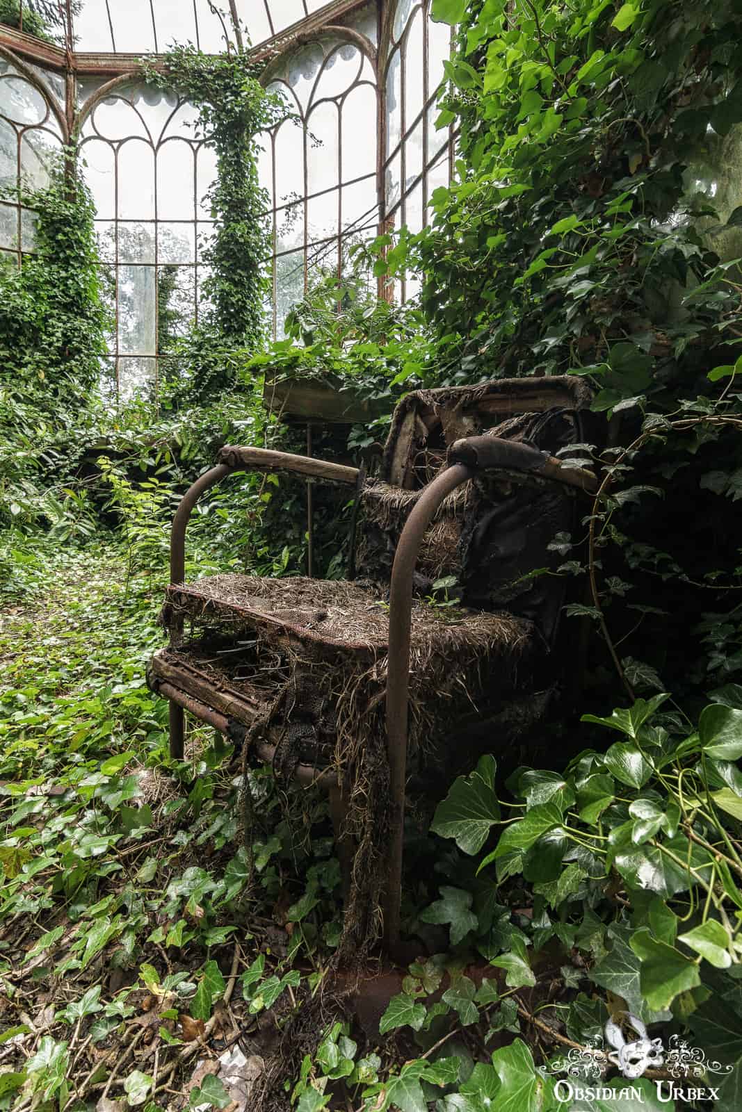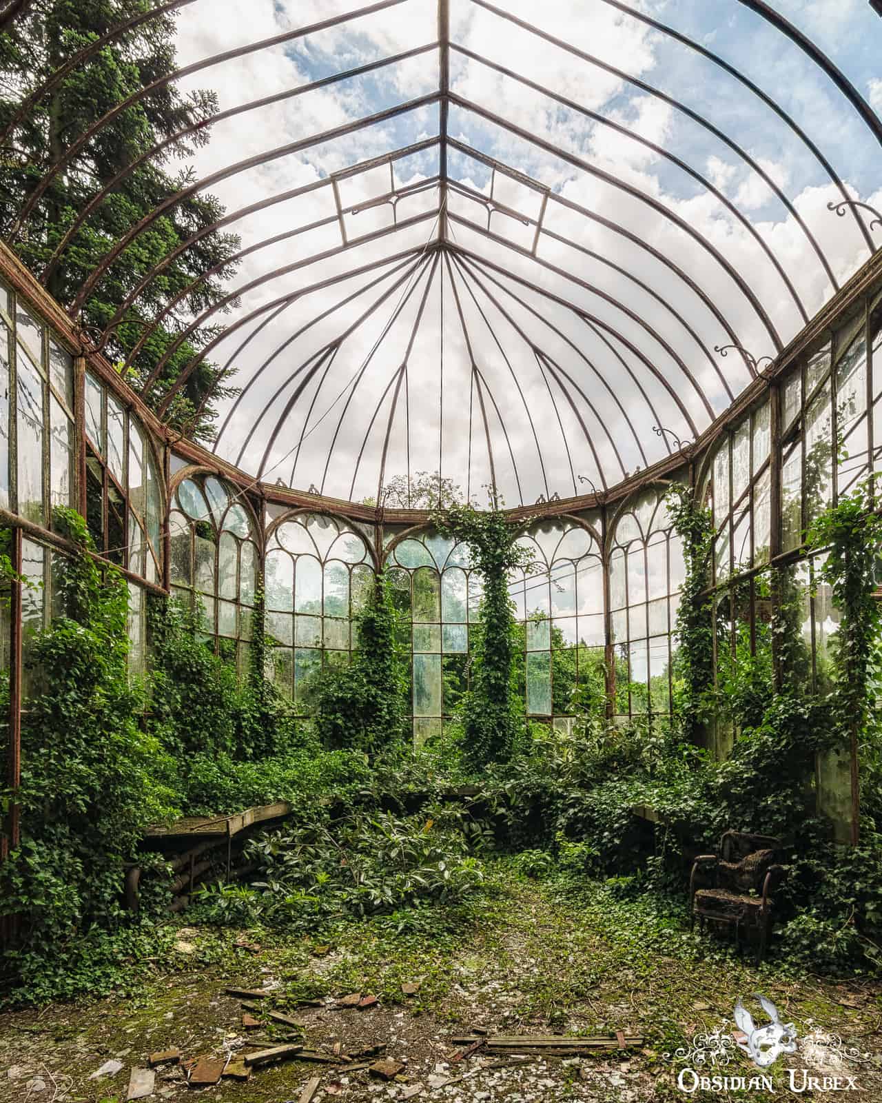 We squeeze (carefully) through a broken window pane, on the morning we visited the greenhouse. We have to scramble our way through the dense vegetation and around the benches one of the side rooms. Picking out a way towards the central chamber, moving with care. Nature was slowly but surely reclaiming this greenhouse. The plants creeping inch by inch up the metal frame year after year. At Chateau Rolls Royce, nature truly did take over. If only for a time.