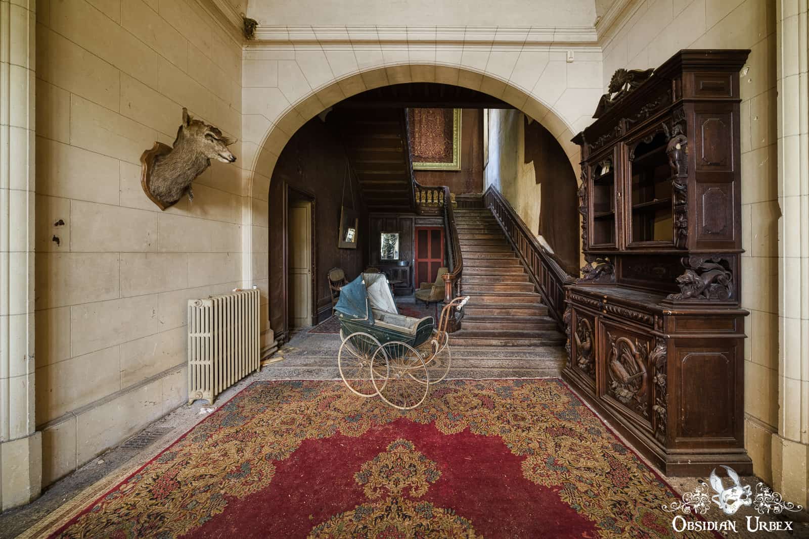 The grand entrance hall has a magnificent mosaic floor, and a sturdy wood staircase that is delightfully creaky to traverse. At the back of the entry, there is a door with a red frame. This unassuming door opens into the magnificent family chapel, which has beautiful stained glass windows. Following on, the main dining room is located on the left side of the entrance hall. Fine wooden cabinets and other pieces of furniture are set against wood-panelled walls. The inlays are embellished with silk covers adorned with gold fleur-de-lis, the emblem of French royalty.
