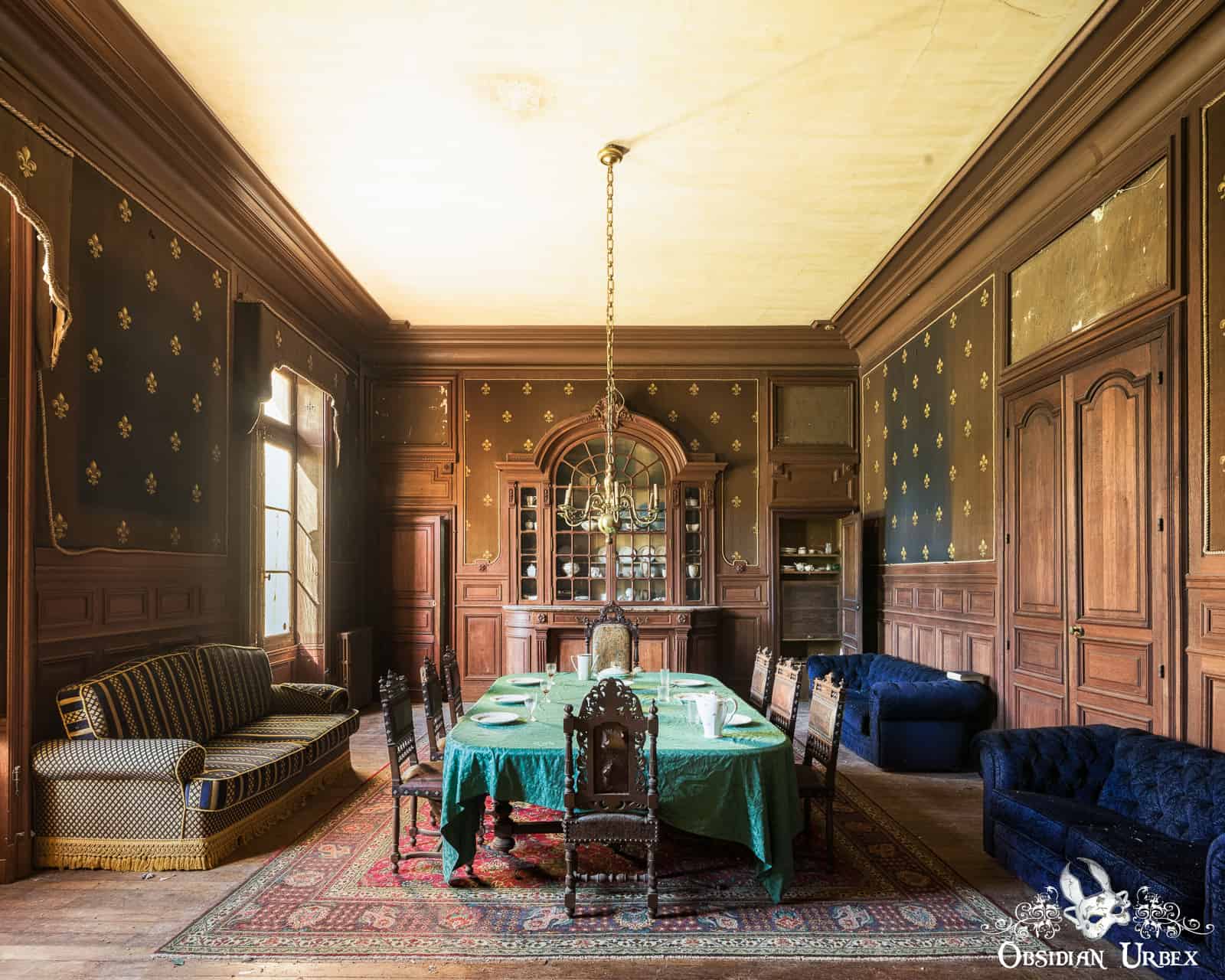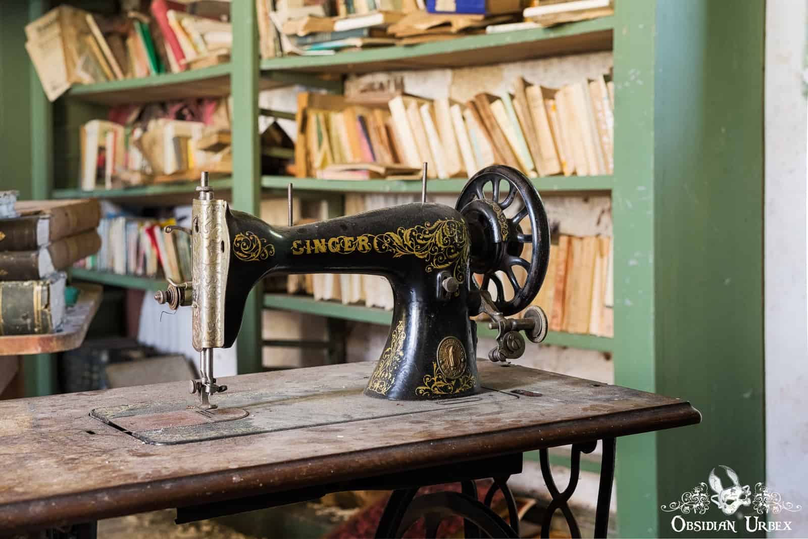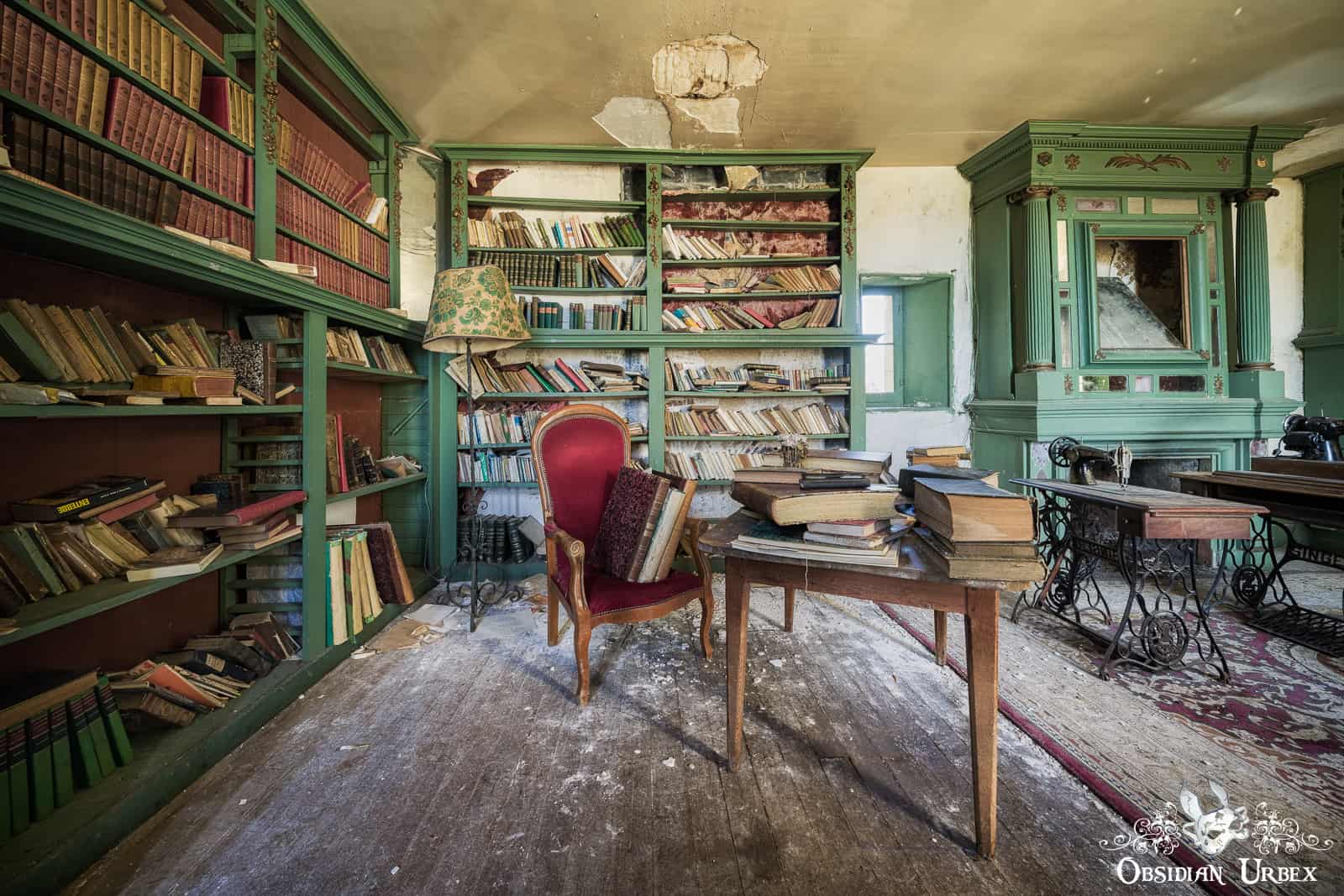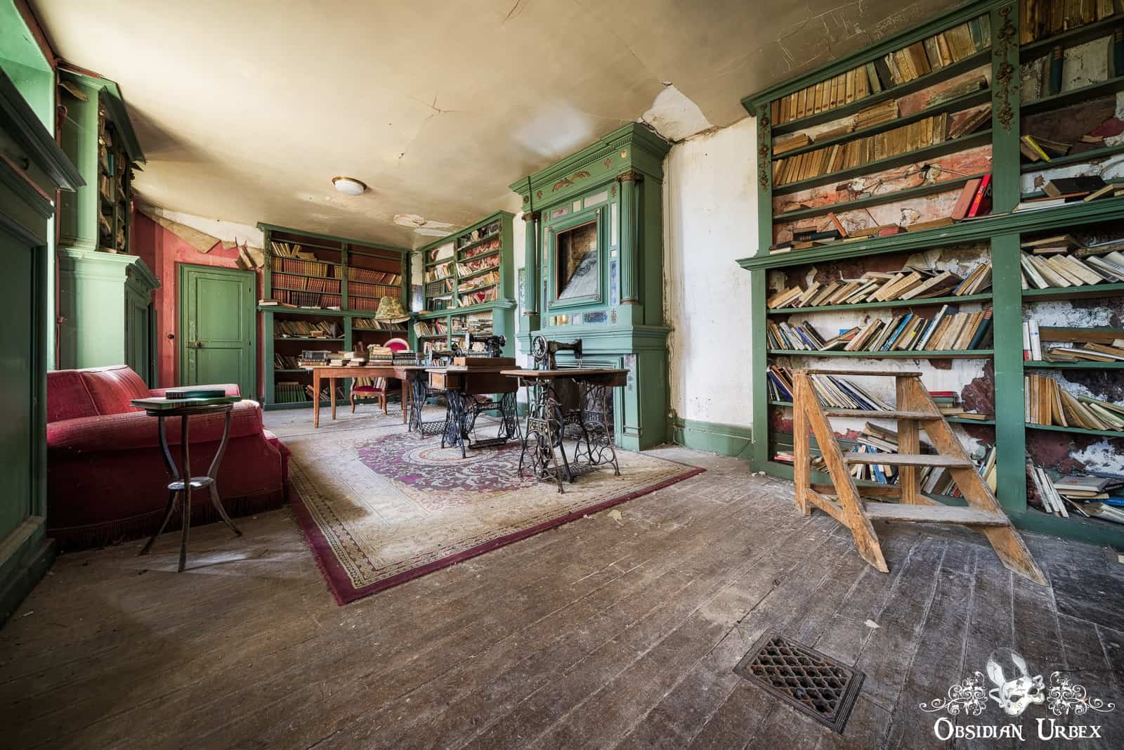 Château Secret is a stunning abandoned Neo-Renaissance-style home in France. Inside, there are rooms upon rooms that are all beautifully furnished, including cute bedrooms, comfy lounges, and plush dining rooms. One of the most beautiful rooms is a green-walled library, with several vintage sewing machines.
