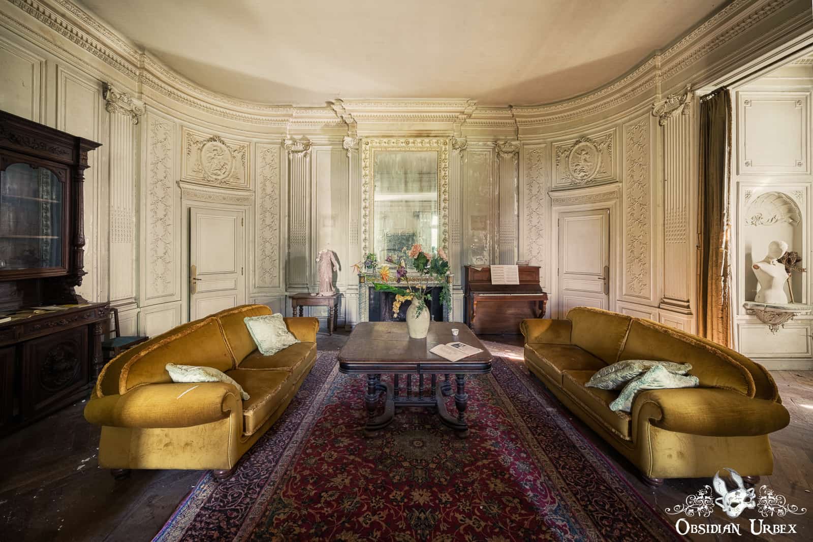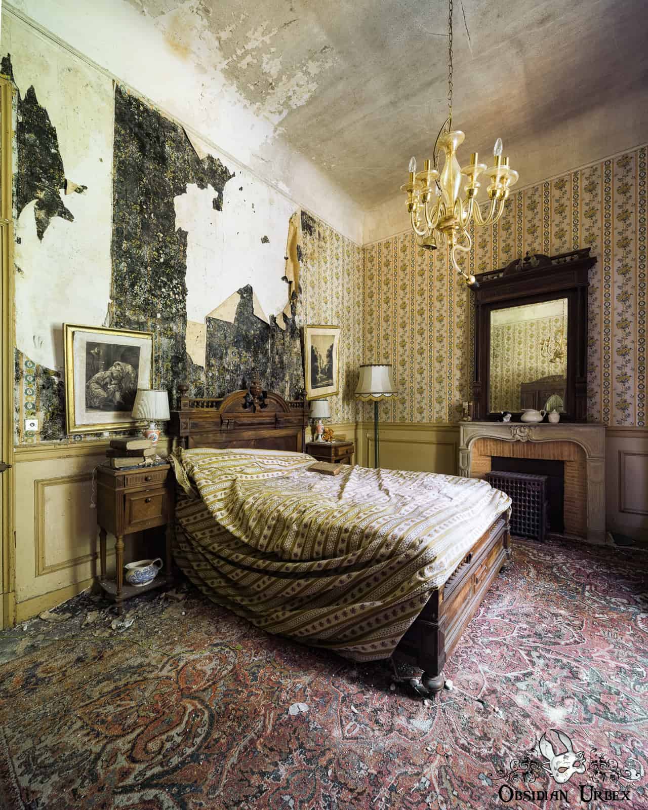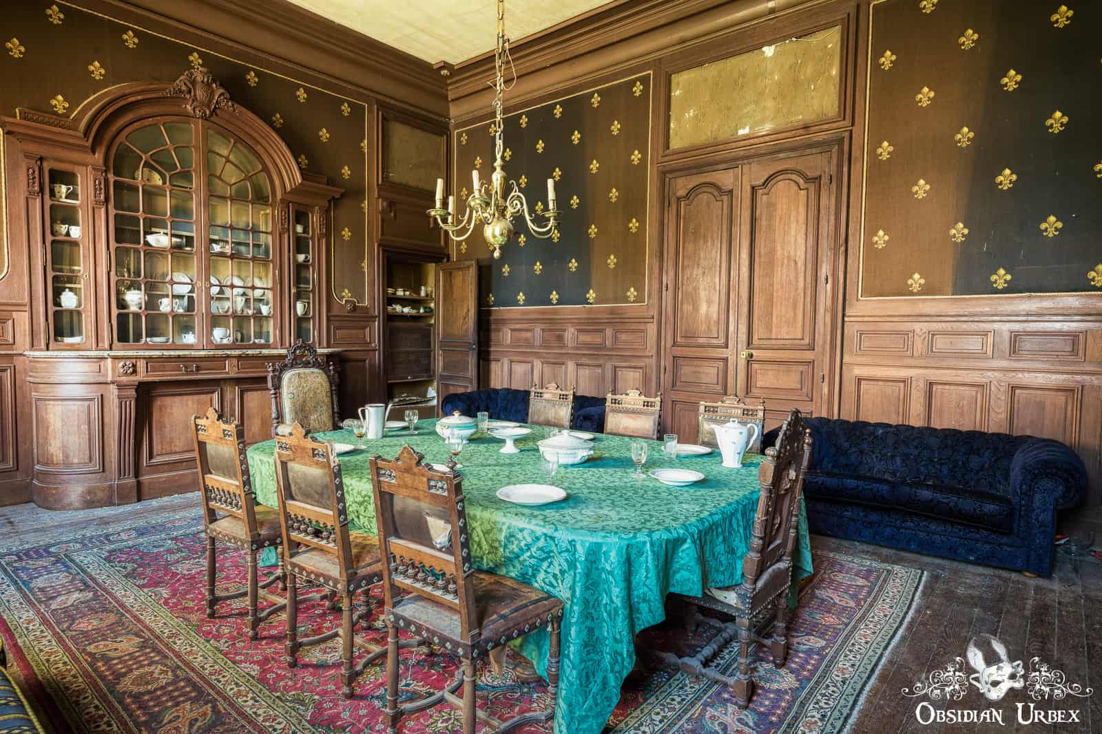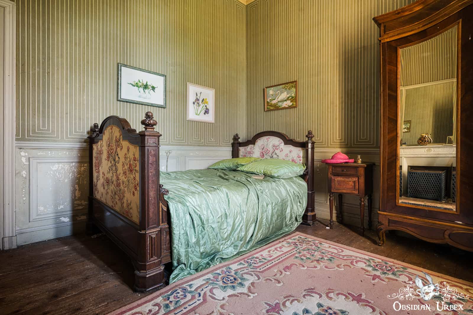 Château Secret is a stunning abandoned Neo-Renaissance-style home in France. Inside, there are rooms upon rooms that are all beautifully furnished, including cute bedrooms, comfy lounges, and plush dining rooms. One of the most beautiful rooms is a green-walled library, with several vintage sewing machines.
