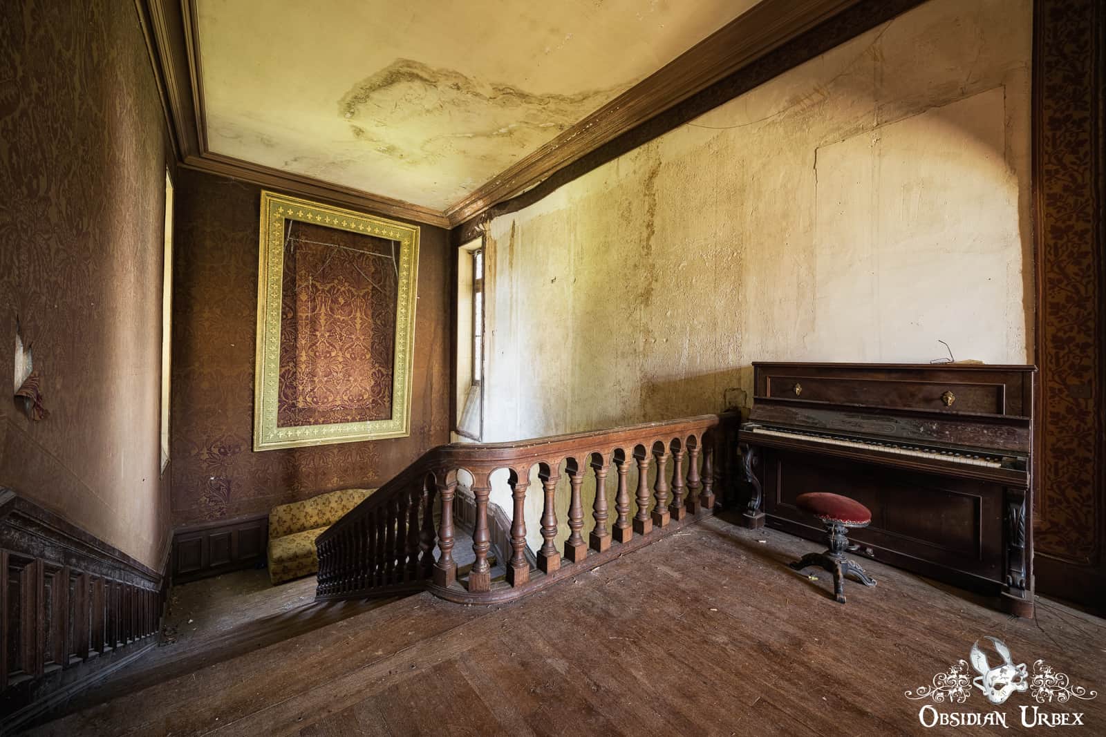On the right side of the entrance hall is the Château Secret grand salon, with its elaborate neo-classical wall panelling and pilasters that lend the space a palatial feel. The grand piano in this room was made by a renowned Parisian maker who was a favourite of Chopin, Stravinsky, and other notable composers. Directly above, on the upper landing, is a second piano, an upright type.