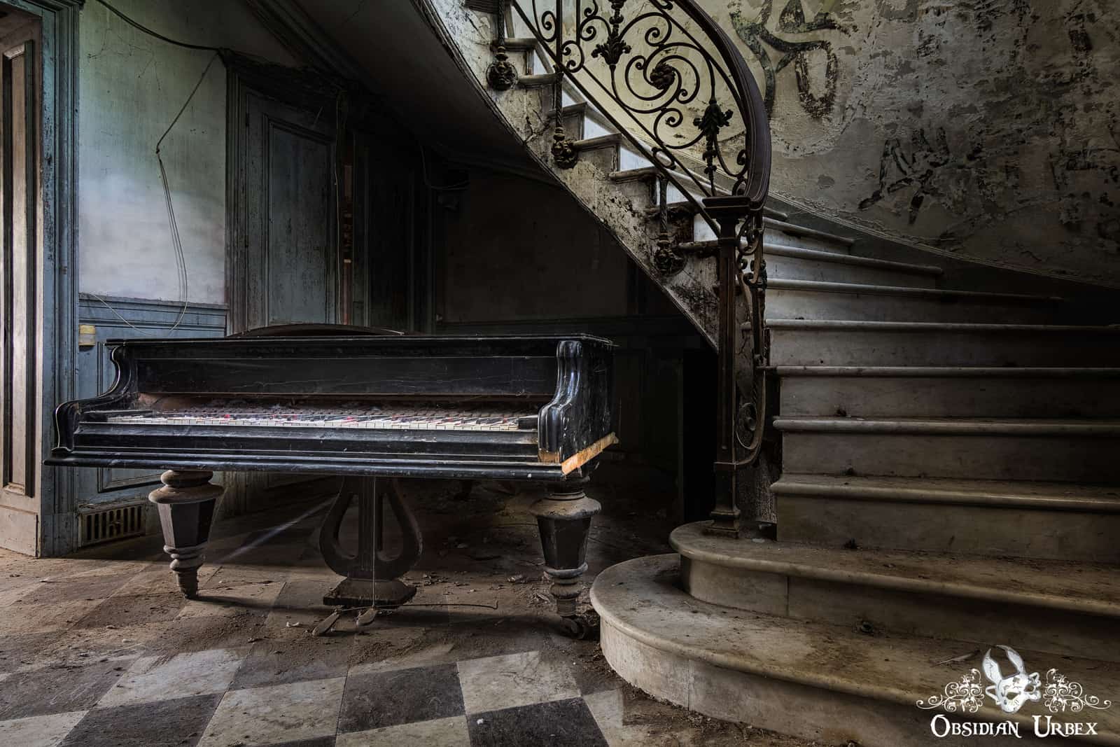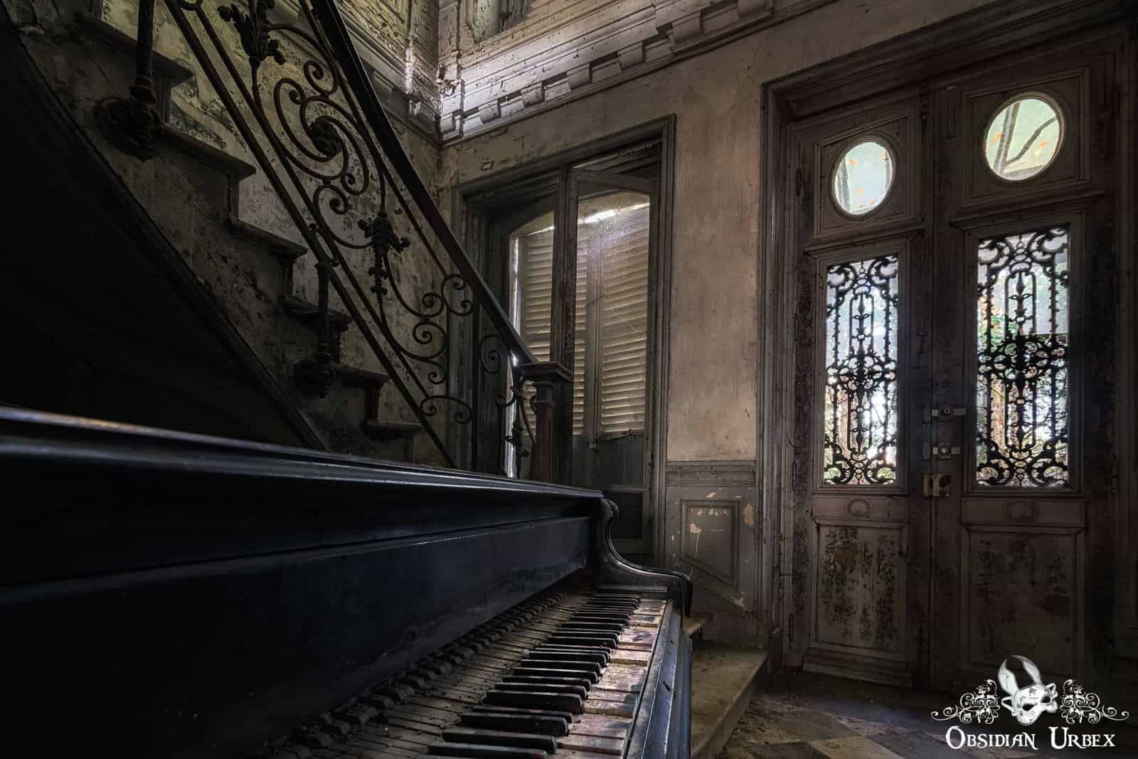 The entrance hallway of Chateau Verdure is the main attraction in this place. There is an old dusty grand piano sitting in an alcove beneath a sweeping stone staircase. The piano lustre has faded and paint has chipped through years of neglect. The sun shines through the window panels of the double doors, casting a beautiful subtle light over the piano keys. The piano stands on a black and white checkered floor which compliment each other beautifully when viewed from the first-floor landing. From this vantage, the wrought iron bannister of the stairs curve around the piano. It is likely the curved shape of the strong stone stairs that is responsible for the structural integrity of this room.