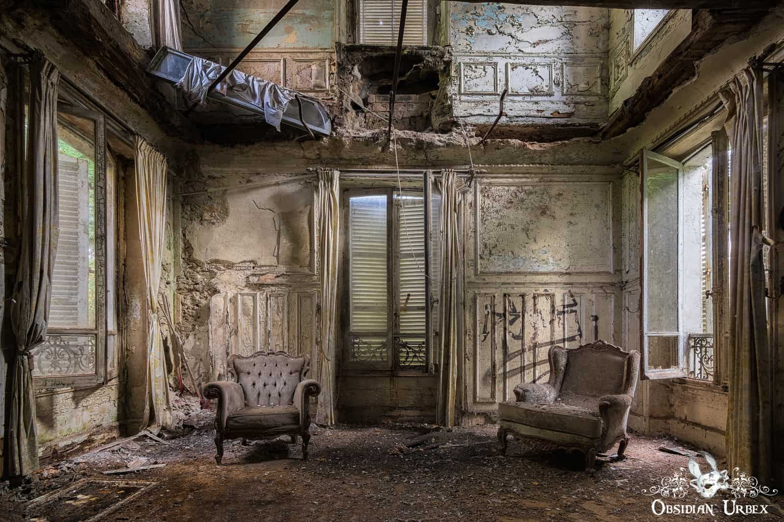 Two chairs stand alone in the middle of a bare living room of Chateau Verdure. The floor above has completely collapsed here. Apart from these chairs and the tattered curtains, there is nothing left here. On the walls of the room about remains of blue painted walls can be seen.