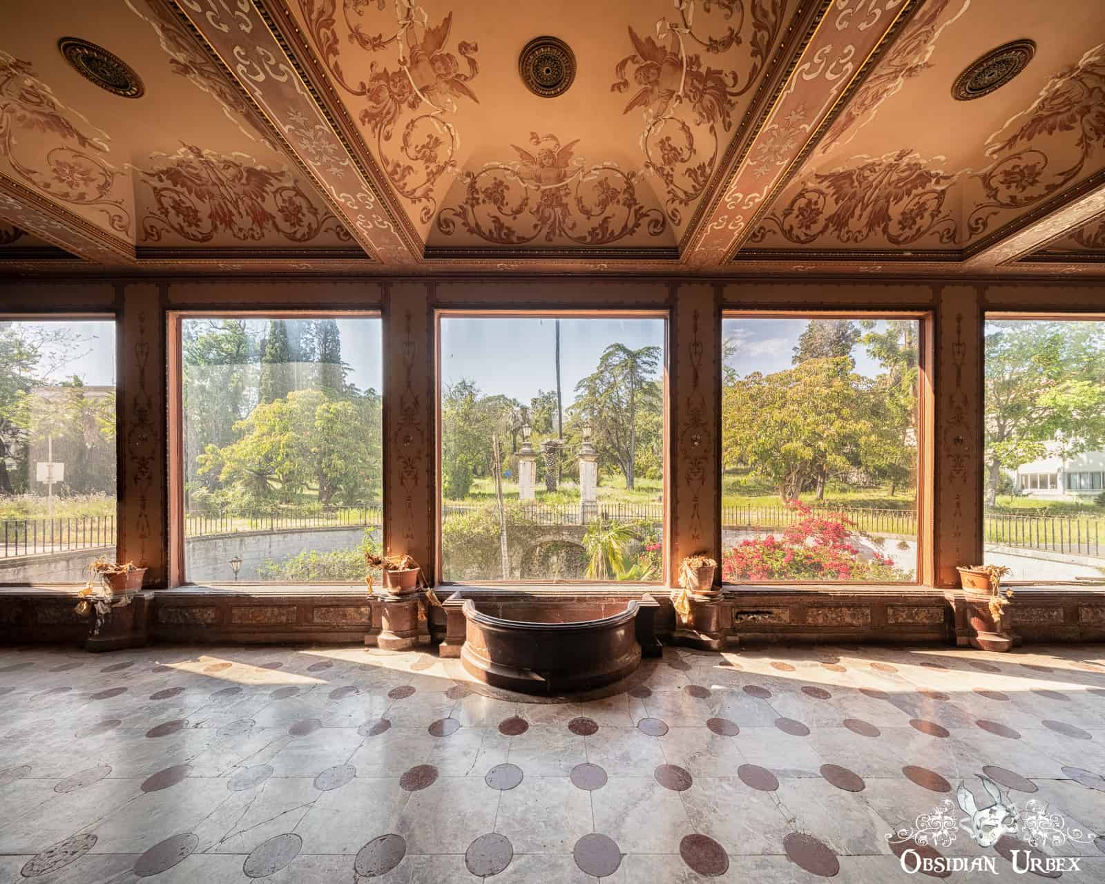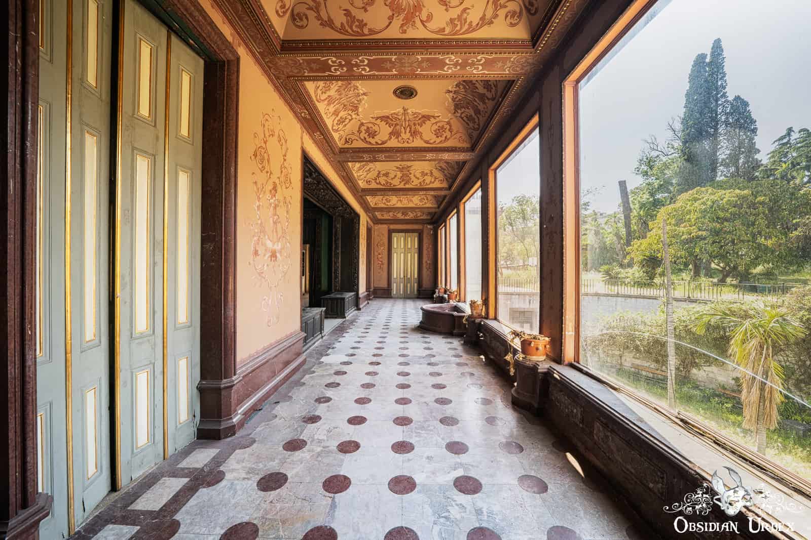 There are many, many more beautiful rooms. A large hallway with the walls covered in green silk and wooden panelling. A gallery with large windows facing the large and once beautiful gardens. Additionally, there is a ballroom, a music room, and a theatre. There are two conservatories or greenhouses, one at either end of the palace.