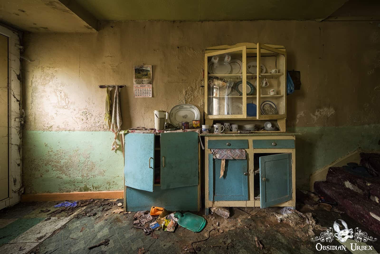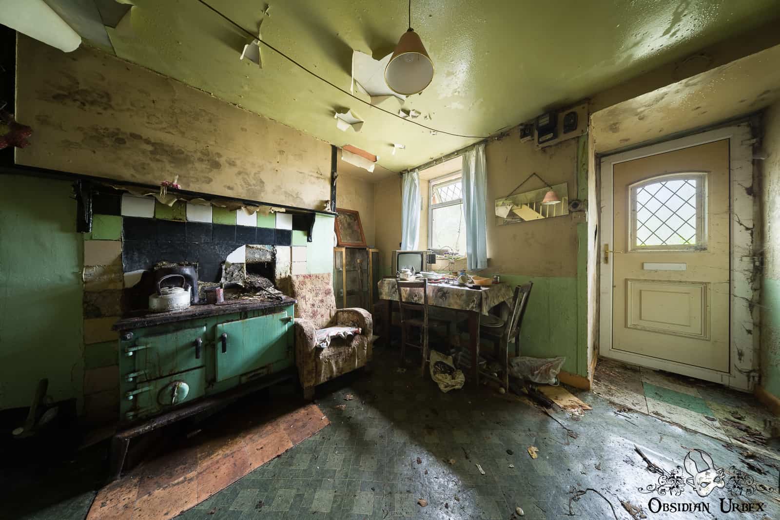 The front door of Green Stove Cottage opens into a small kitchen and dining room. The old green stove is thick with grease from meals cooked long ago, by someone who has likely now passed on. Surrounding the stove are white and green tiles. Above the stove the wall has black mould. On the table beside the window is an old CRT TV and a disorganised collection of plates and other kitchen paraphernalia. Decorative plates are stacked kitchen cupboard shelves, the doors hang slightly open giving them an untidy appearance. The calendar on the wall, next to the hanging tea towels, is from January 2006.