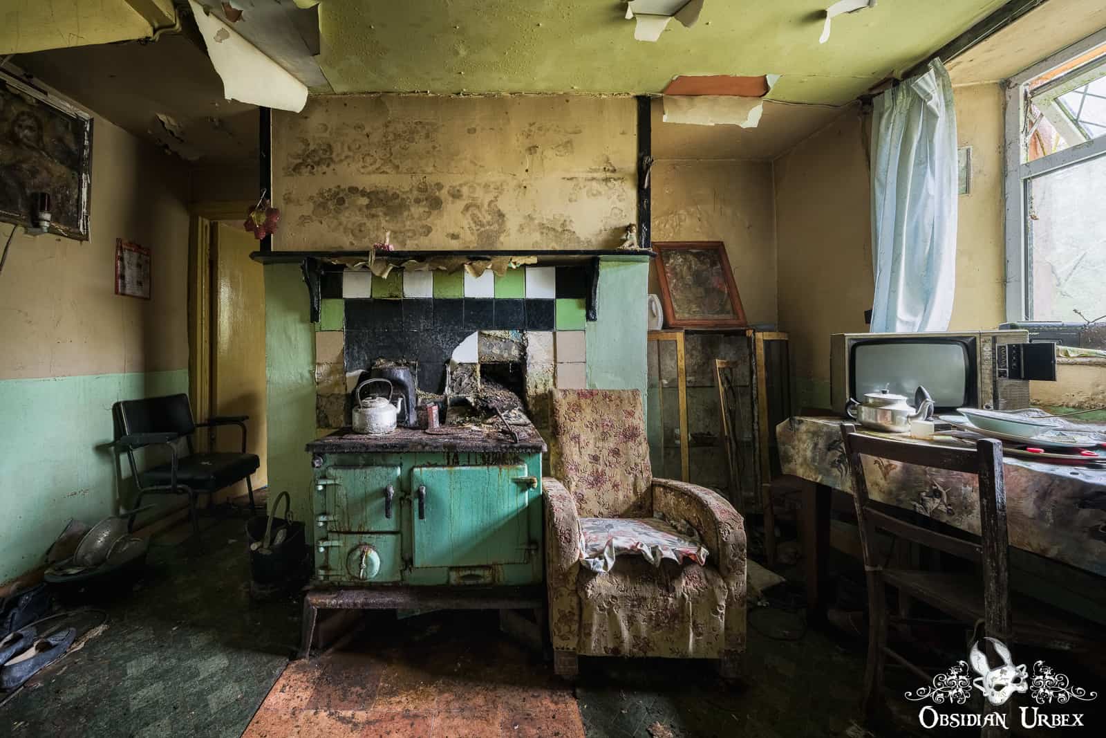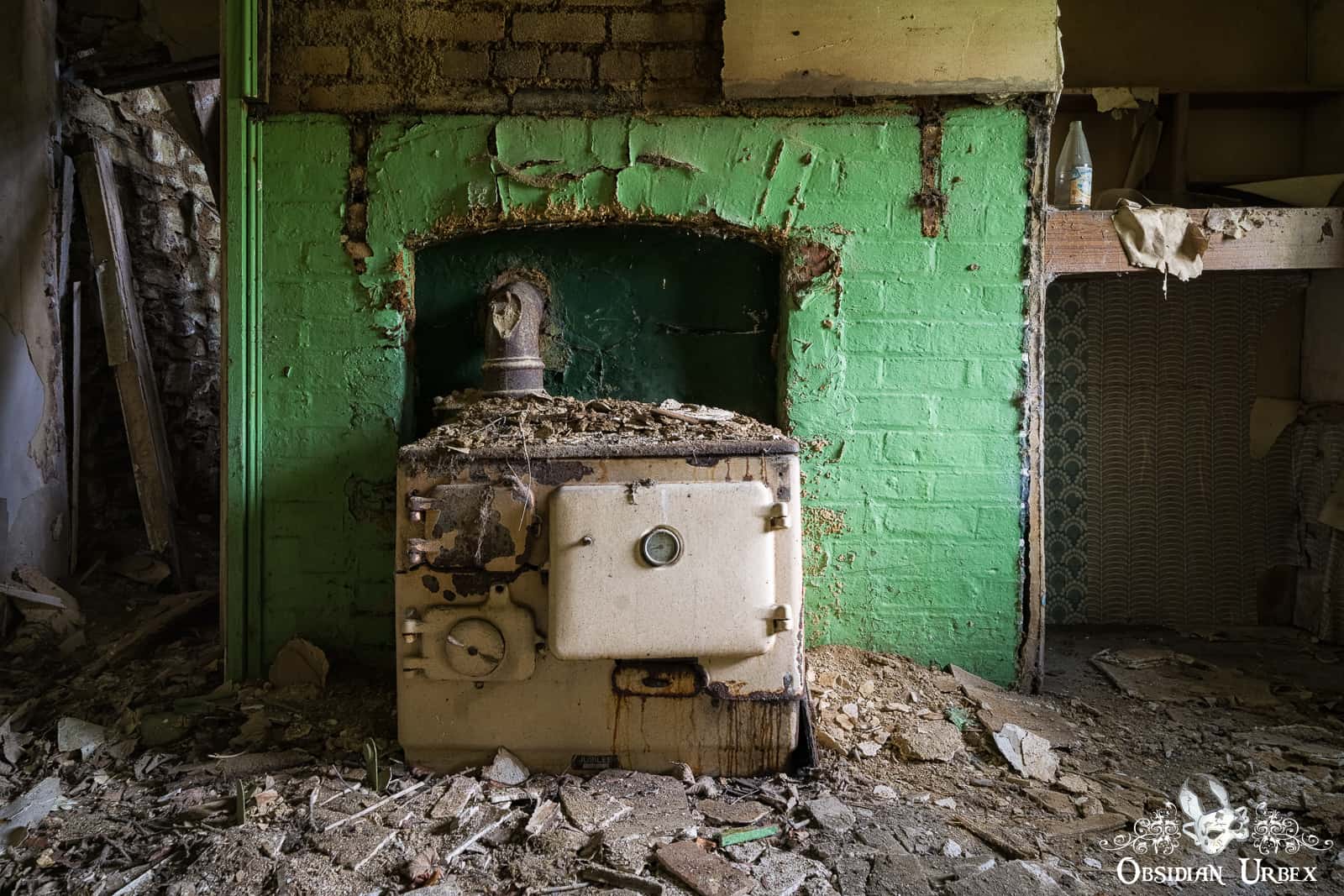 The space behind the stove, accessed by the passway to the left of it, was a small room stuffed full of rubbish. Not sure I saw an indoor bathroom, now you mention it. Just those two rooms downstairs. Upstairs there was the bedroom I photographed, as well as another bedroom that was half collapsed and too full of junk to get a good view of photos.