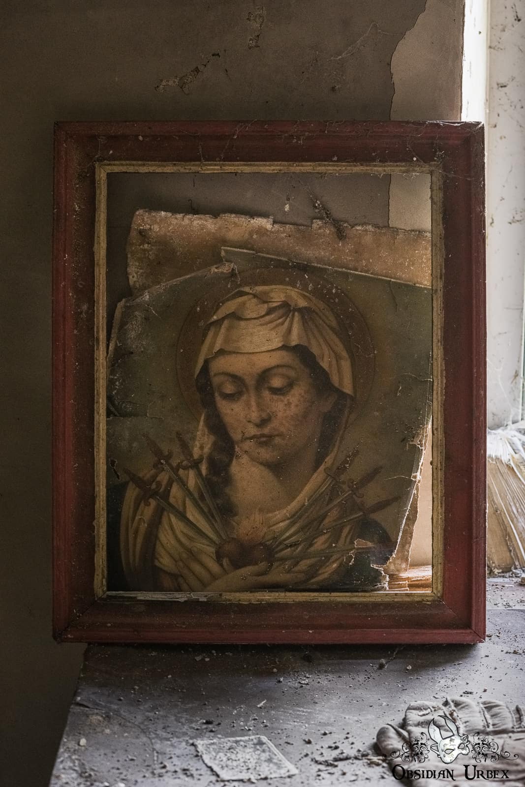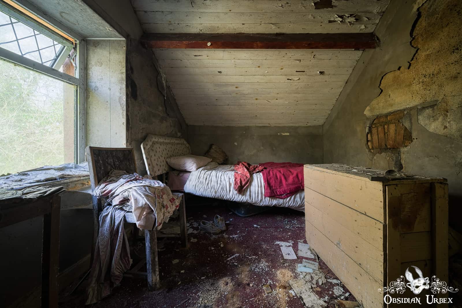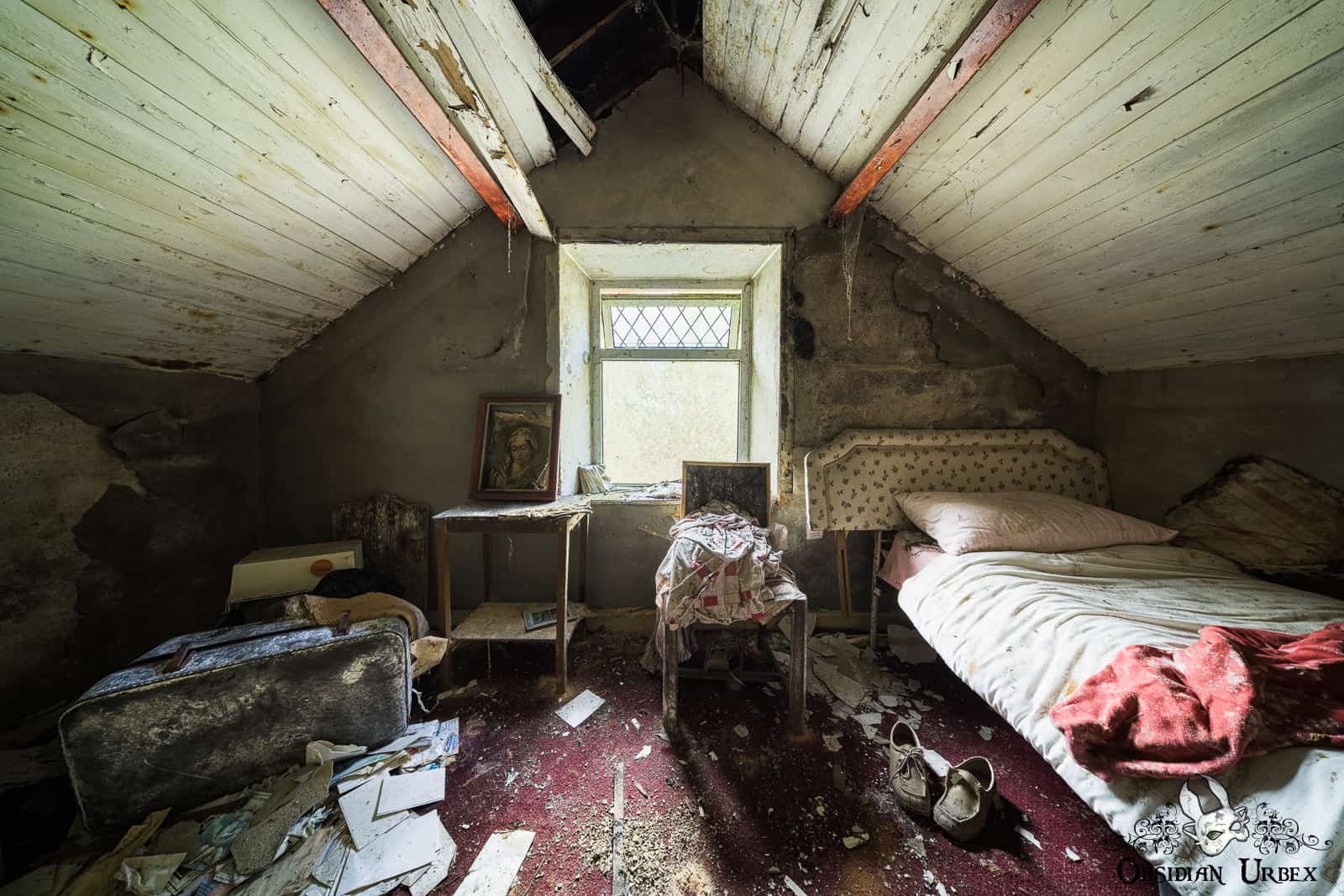 The upstairs bedroom is more decayed, thanks to a leaking roof. There is an old suitcase here, with paperwork scattered on the floor around it. The curtains have fallen from the wall, but someone has piled them untidily on a chair that stands next to the bed. On a table is a portrait of The Seven Sorrows of Mary.