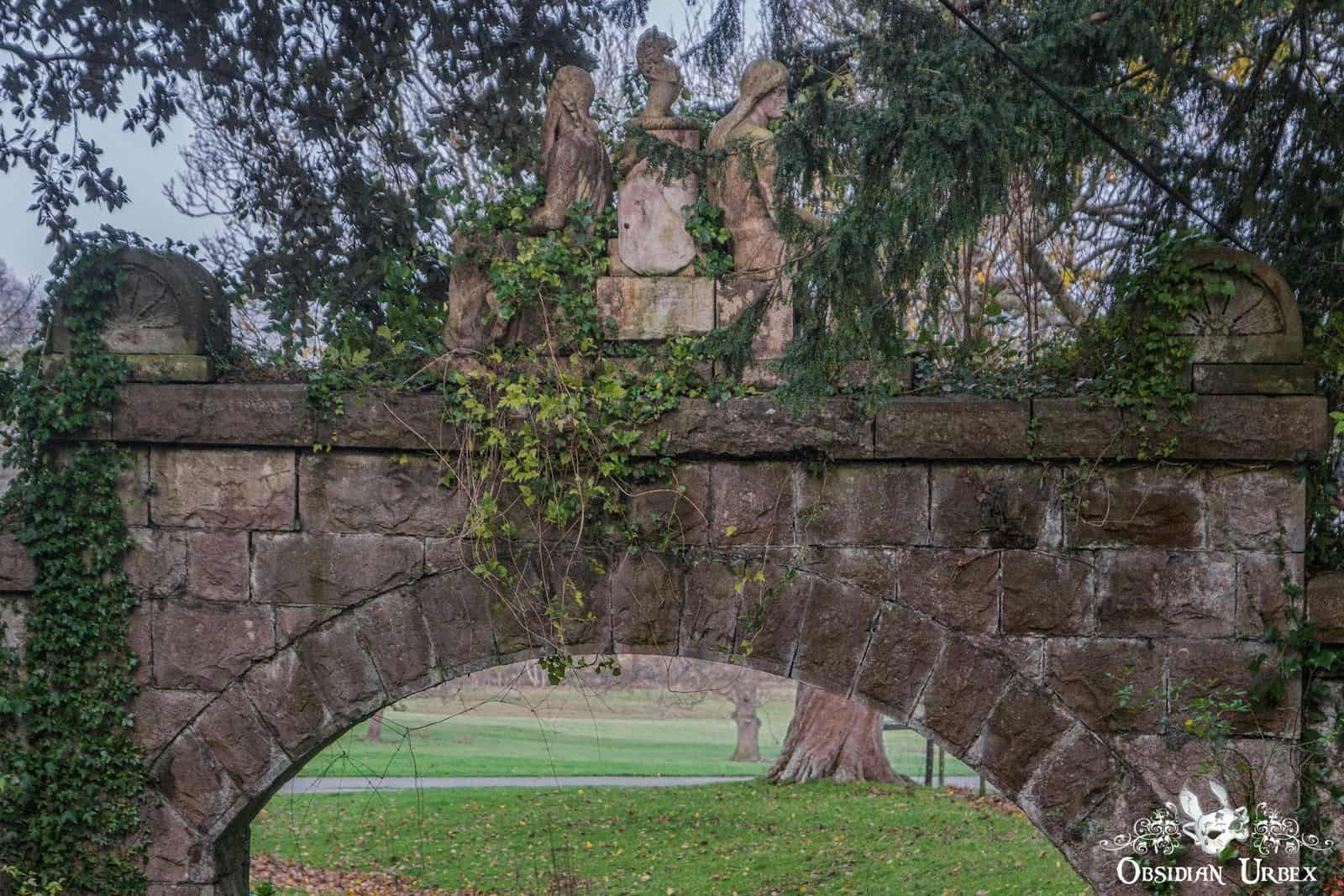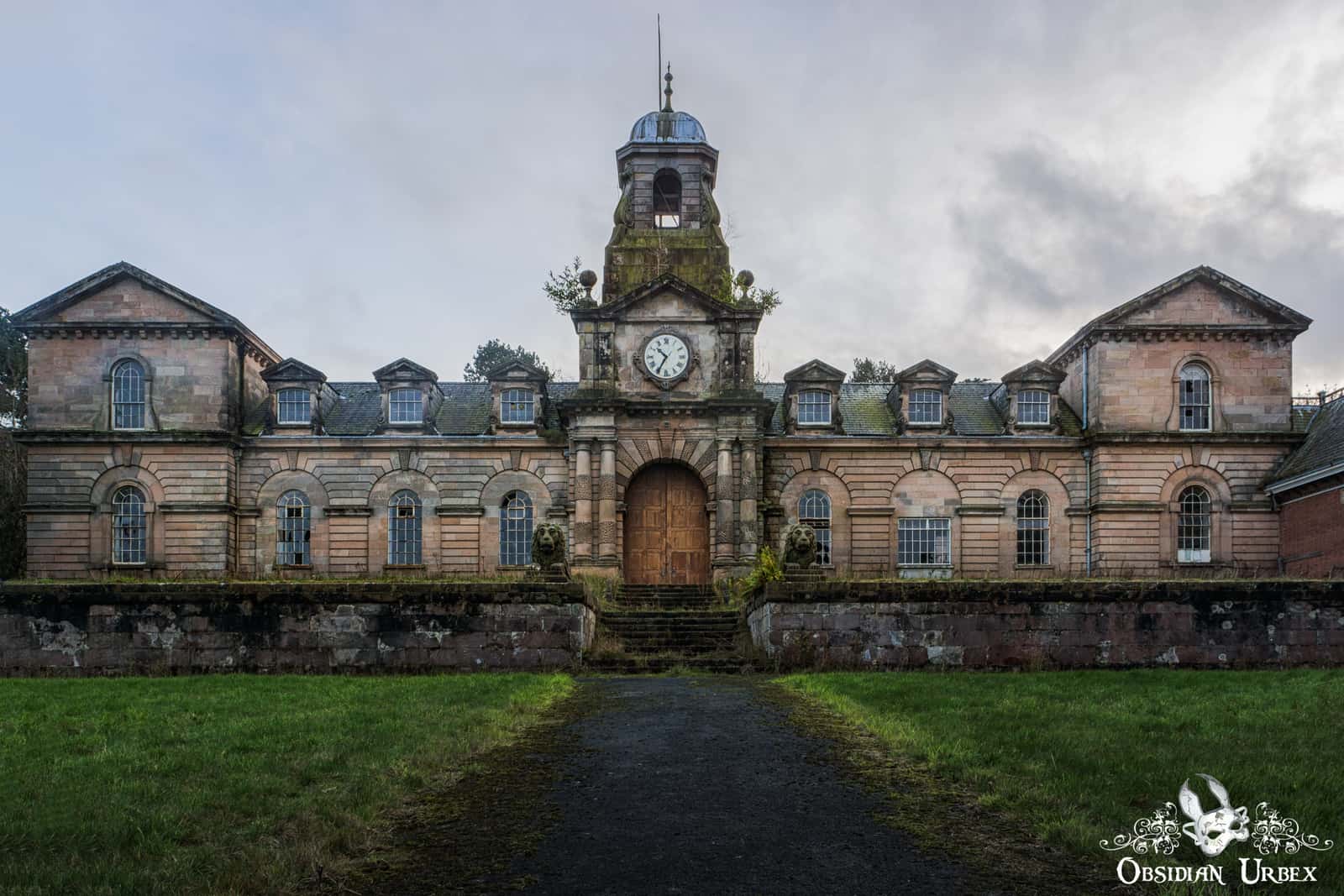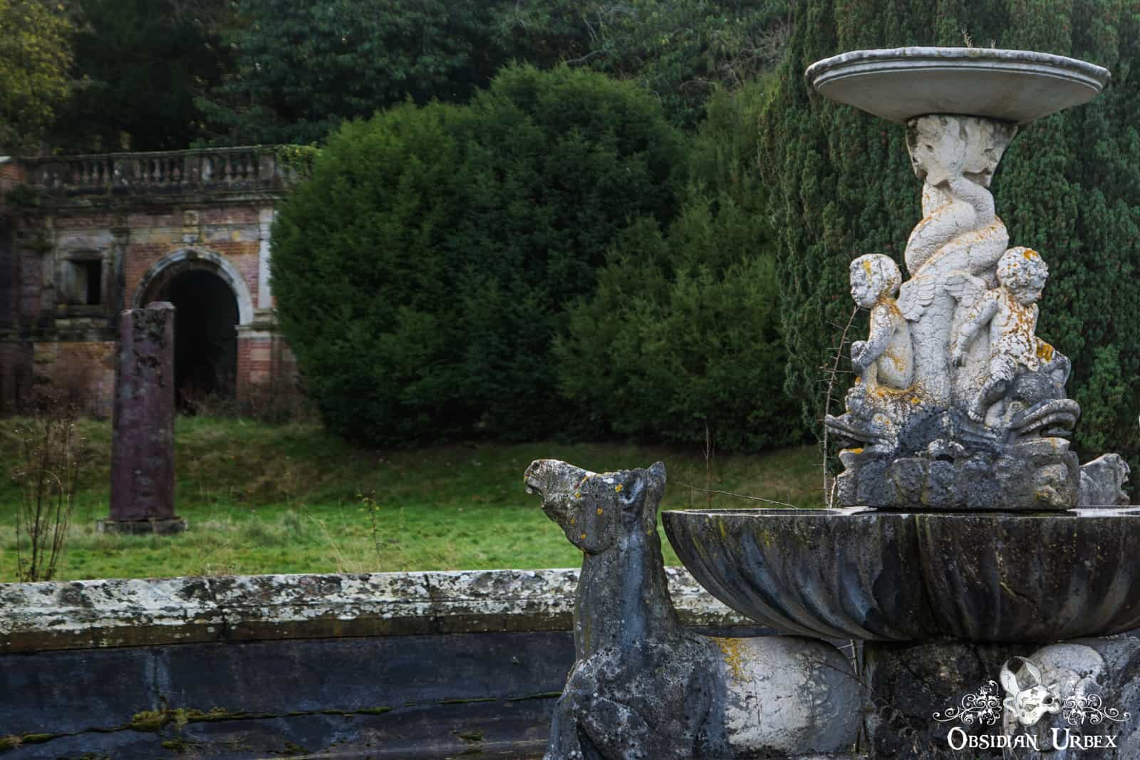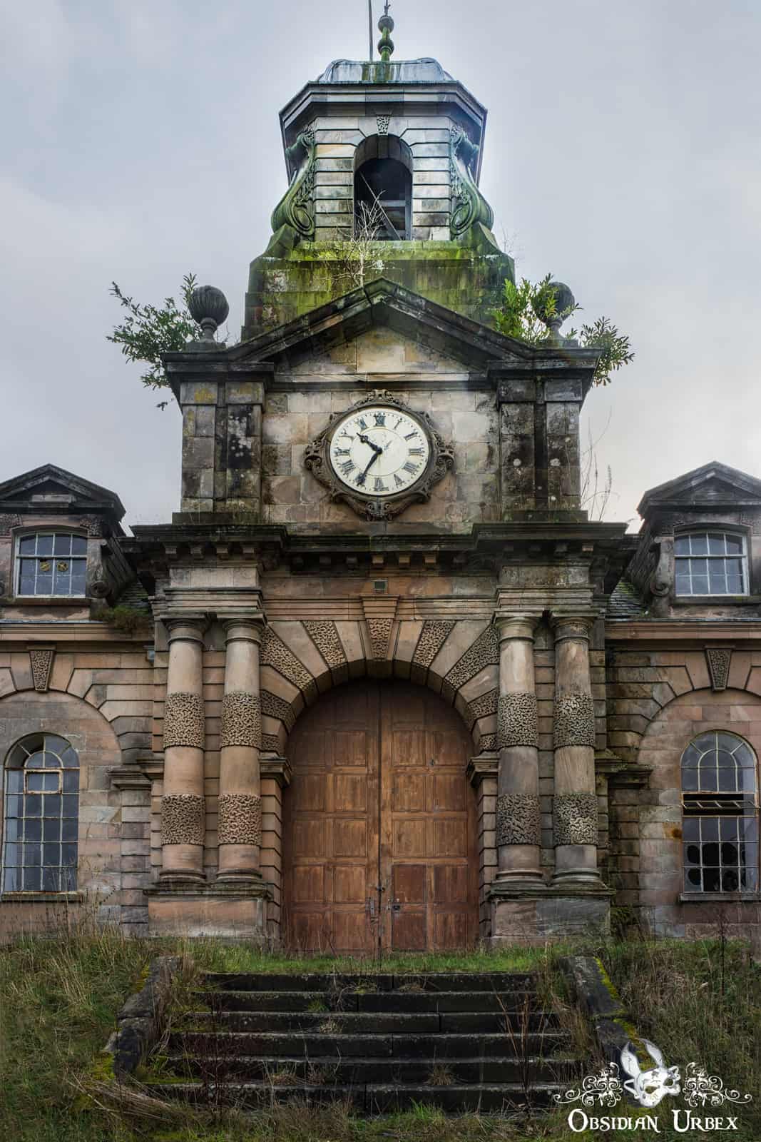 The Neo-palladian style stable block features large stone lions, guarding the stairs to the main pedestrian entrance. There is also a clocktower. The horse riders entranceway is overgrown and impassable. The old stone entrance way can be seen at the perimeter wall of the grounds, and features a heraldic shield and stone statues.