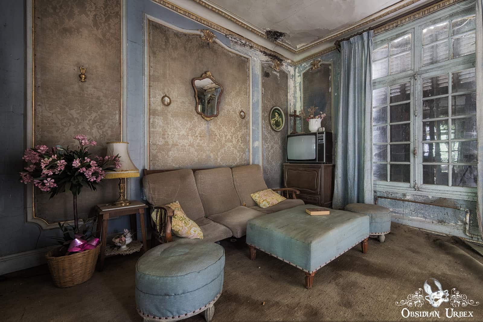 The sitting room featured textured grey Damask-printed wallpaper, inset into panels. These are accented with pale blue surrounds, and gold and white-painted beading and decorative mouldings. The well-worn and moldy sofa compliments this colour scheme perfect. It appears that books and conversation were the favoured pass-times in this room, the small CRT television is tucked away and appears to be merely an afterthought. A cross stands above the television.