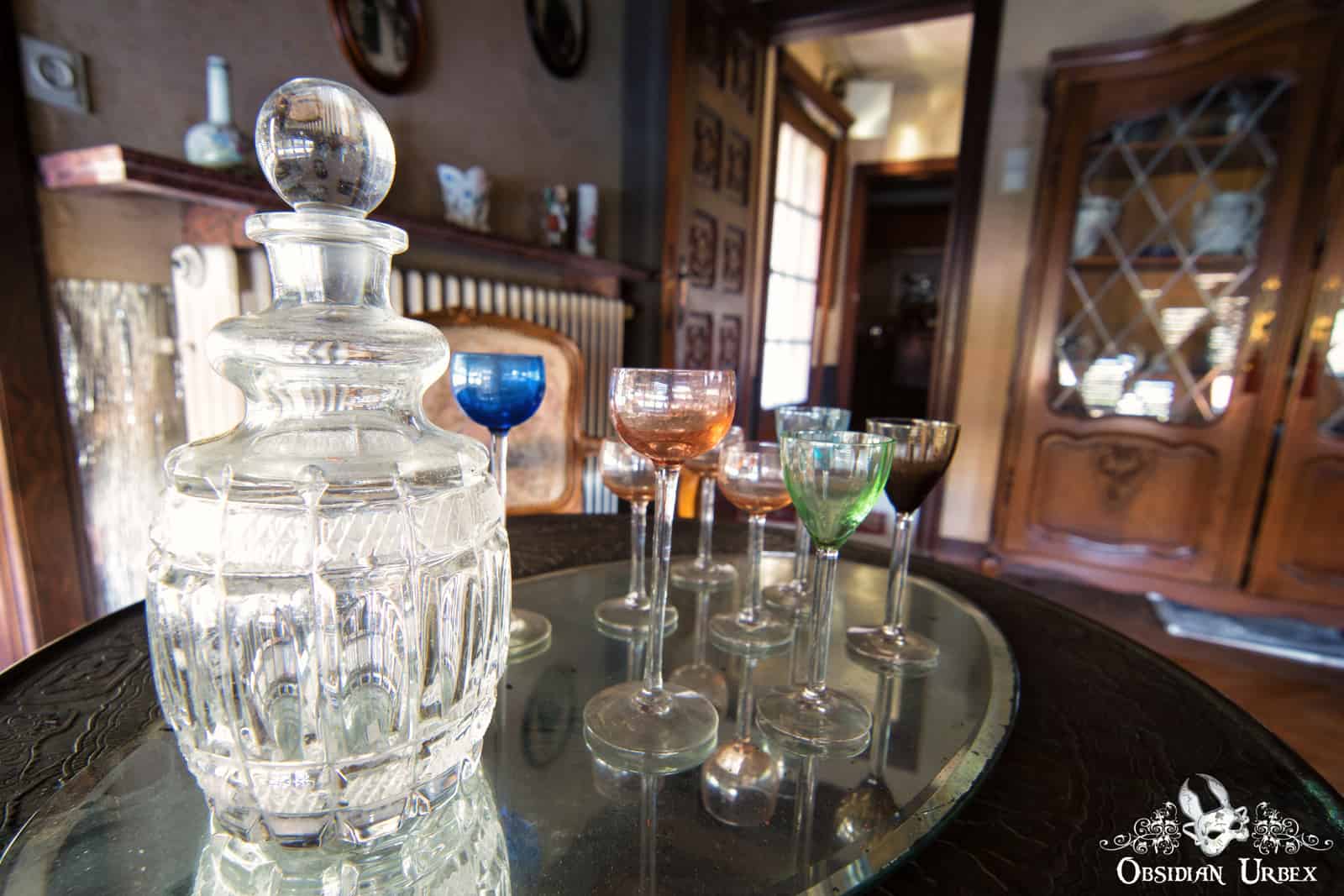 The furniture in the lounge is very grand, all antique wood and leather. A crystal decanter sits on a side table, with very elegant long-stemmed glasses which are brightly coloured. A large blue and white embroidered rug cover the floor in front of a large and ornate dark wood fireplace, complete with engravings. A large heavy wooden table with many chairs, still with table cloth and decorative tableware. A grandfather clock stands in the corner, silent. Framed photographs of the owners can be seen on the wall, and scattered lose prints sit on a footstool. The sun-faded outlines showing the ghosts of old wall-mounted picture frames suggest that a lot of these have been taken from the dining room, either by the owners or persons unknown
