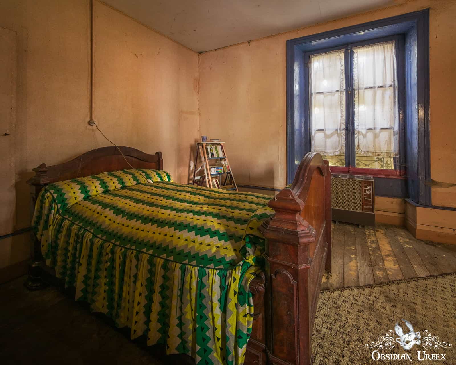 When we visited Manoir du Philosophe during our Easter 2018 road trip, the downstairs was a chaotic mess. Personal items littered the tables, presumably by “visitors” in search of valuables. The light was also failing, as sunset approached. Between the untidiness and the poor light, the downstairs was not photographed. Instead, we occupied ourselves with the colourful and retro-decor in the bedrooms.