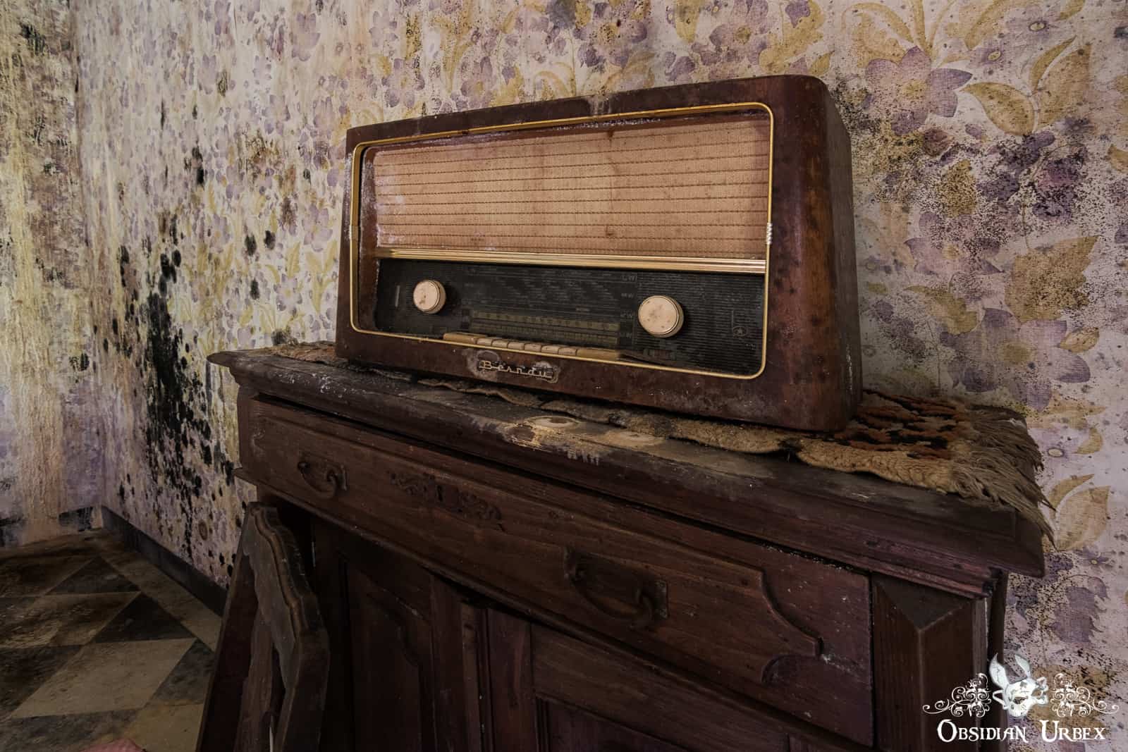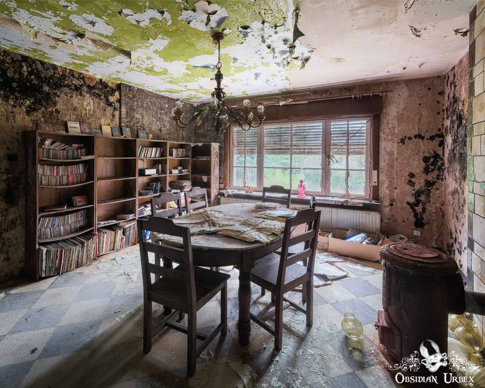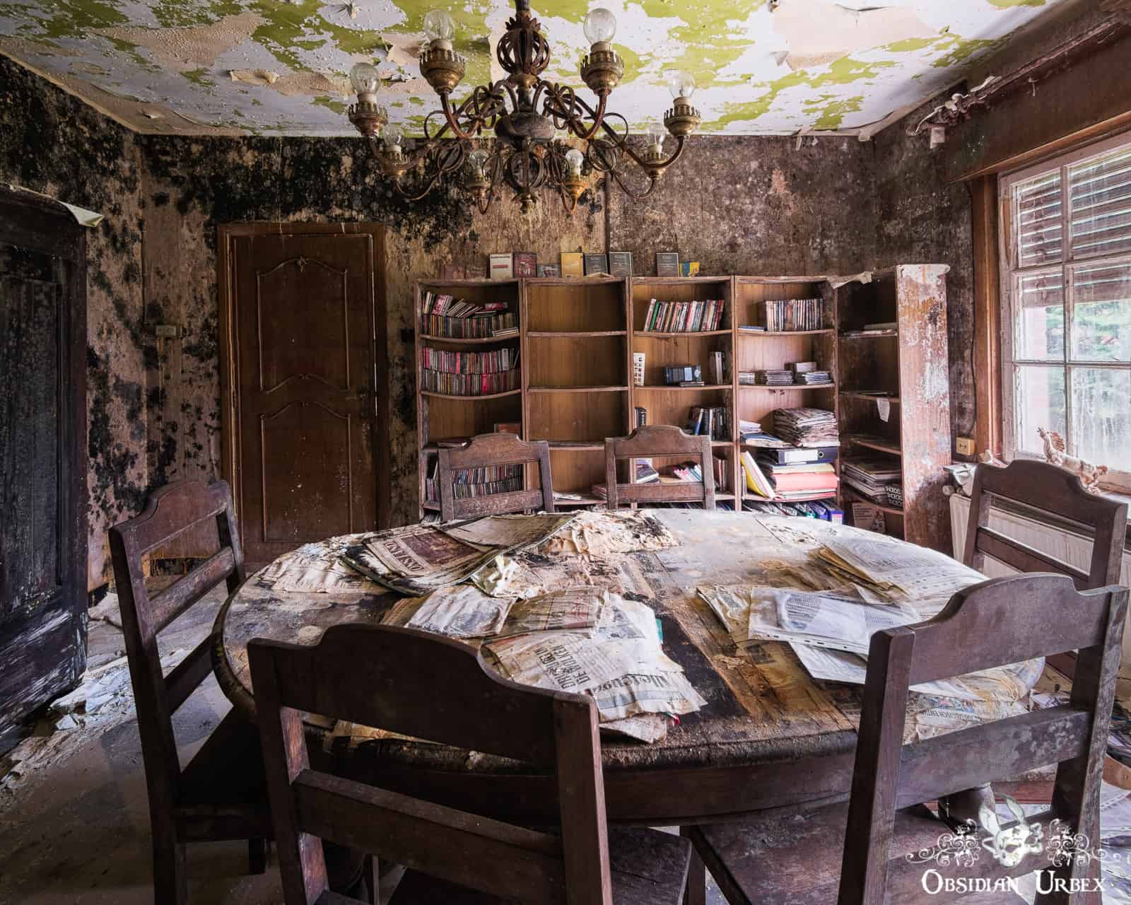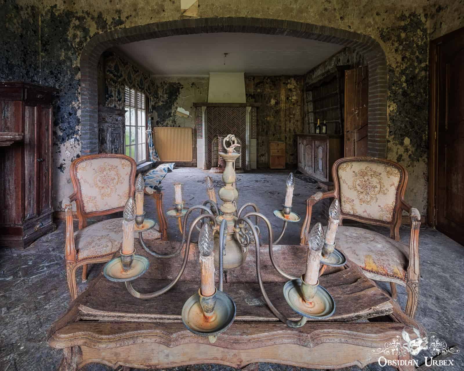 Most of the photogenic rooms inside Masion Francine were downstairs. Firstly, I explore the living room. The living room is long, with a brick archway dividing the room in two. There is a small table and several chairs in here. A detached chandelier sits on the table, covered in dust after years of neglect. The beige wallpaper is very patchy, with large patches of black mold. On first glance, the black appeared to be part of the wallpaper pattern it was that prominent.