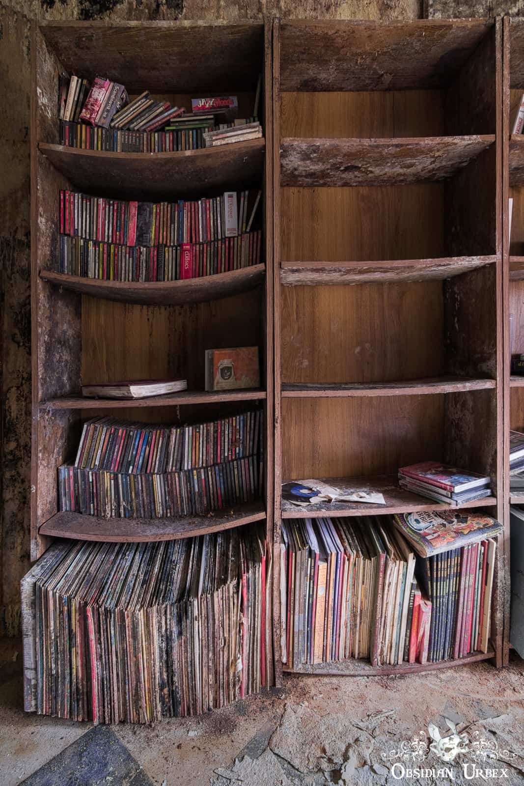 On the other side of the house is the dining room. This room has some interesting sagging bookshelves. The shelves are buckling under the weight of CDs, books, and records.