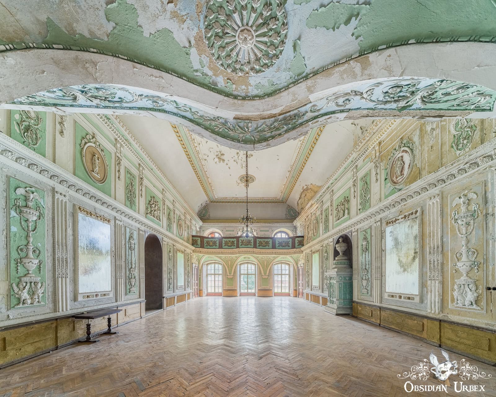Another highlight within Pałac B the spectacular mint-green ballroom. Spanning two floors, this bright and airy space exudes class. Stucco and frescoes cover the walls, and balconies overlook the ballroom floor. A marble urn on a plinth stands to one side of the hall. Adjacent to the main ballroom is a smaller, similarly decorated space, perhaps a secondary ballroom.