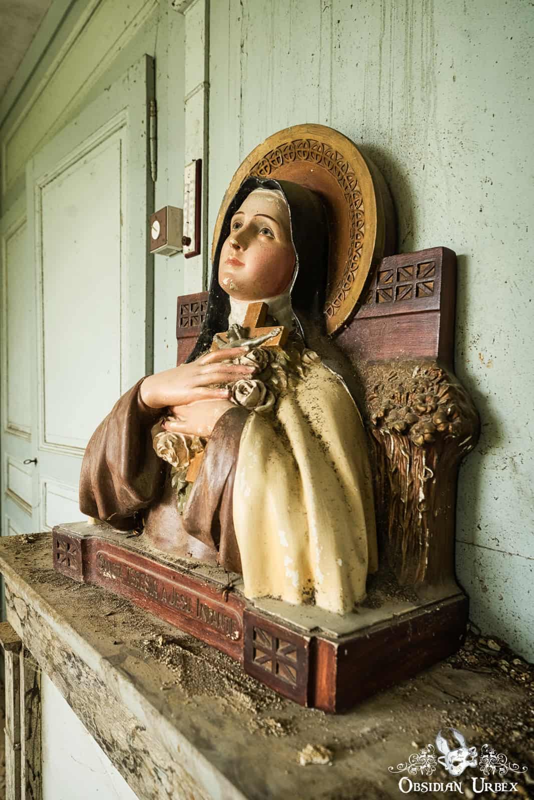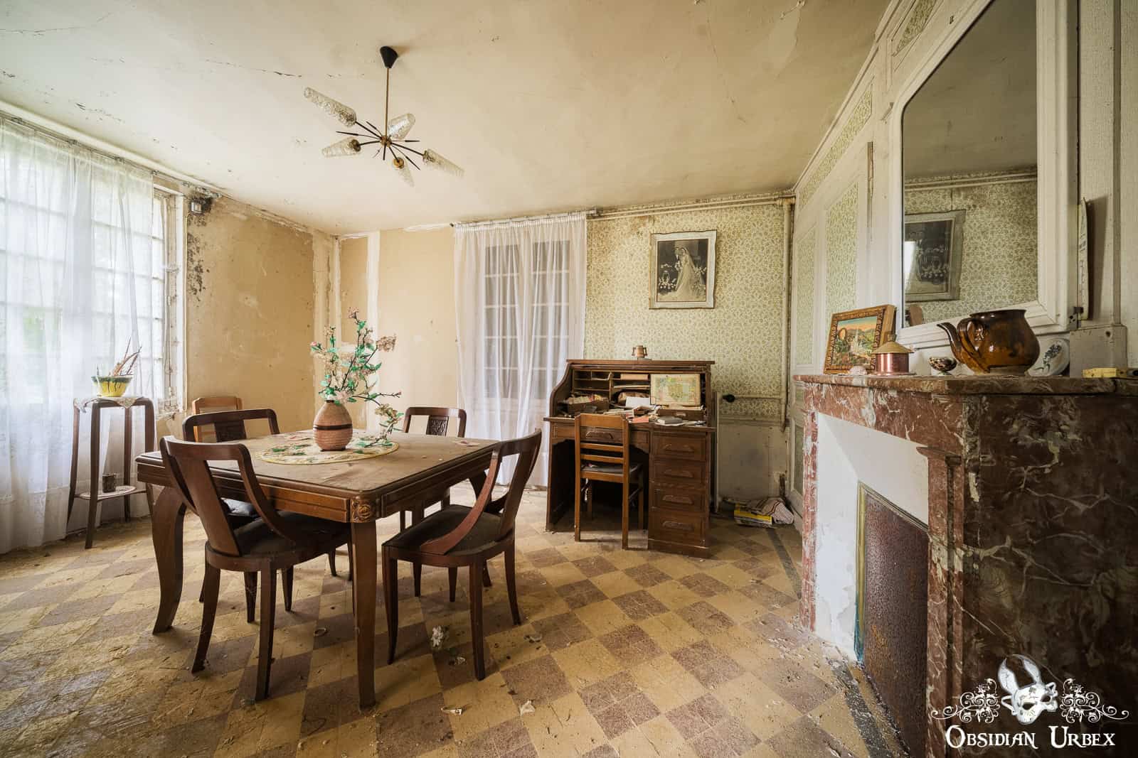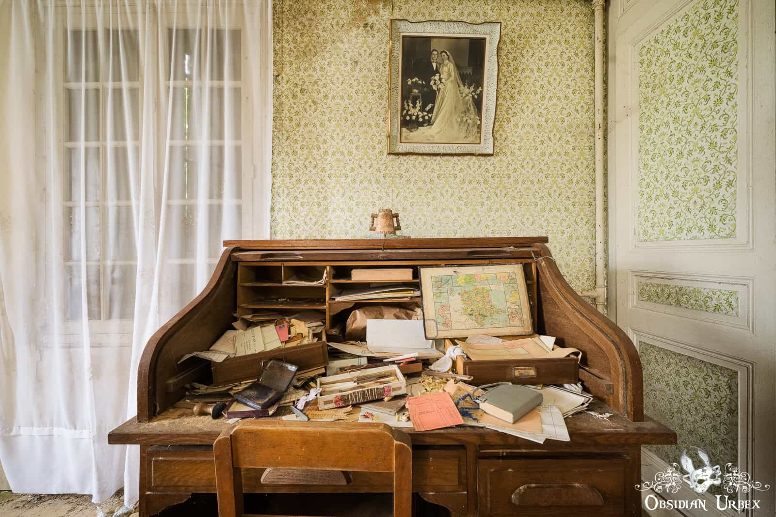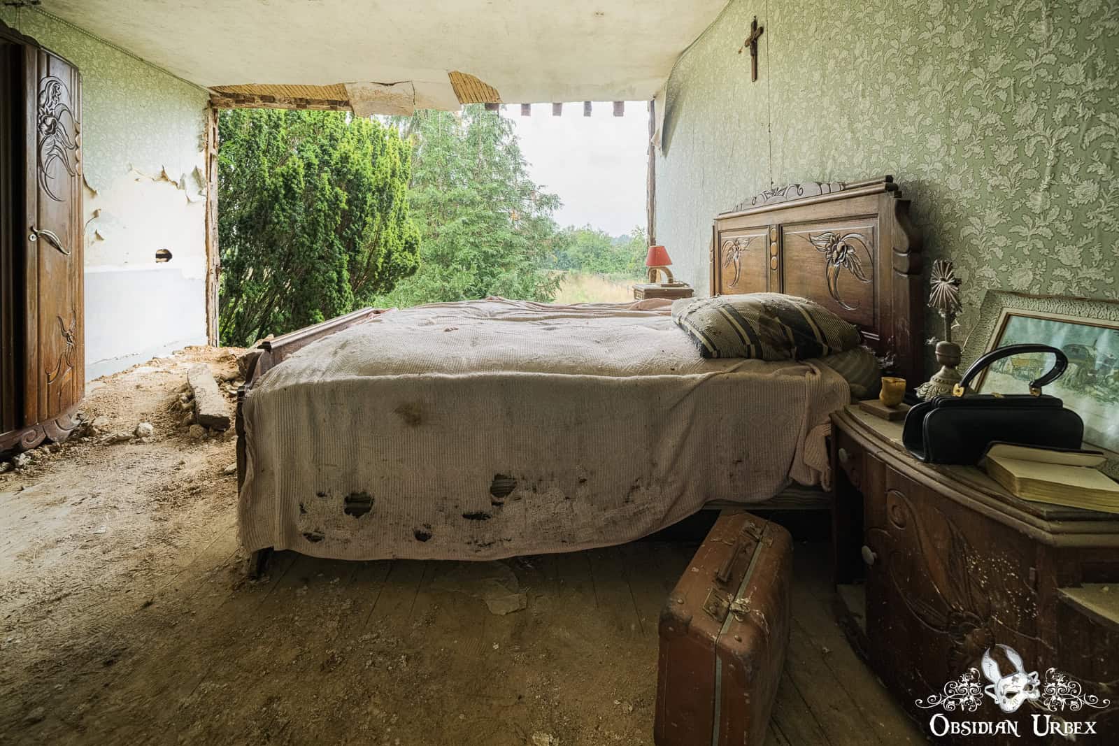 The final room, is the most beautiful (at least, to me). The entire wall has fallen away, giving a panoramic view of the green French countryside. The summers sun, filtered through some fortuitous clouds, create wonderful light and subtle shadows. The old bed has a tattered and moth-eaten sheet on it, and only a single pillow. Either side of the bed are night stands with lamps and some other belongings; a bible, a handbag, a framed picture, an ornamental horn on a plinth and a service bell. In front of one of the night stands is an old suitcase, seemingly all packed and ready to go.