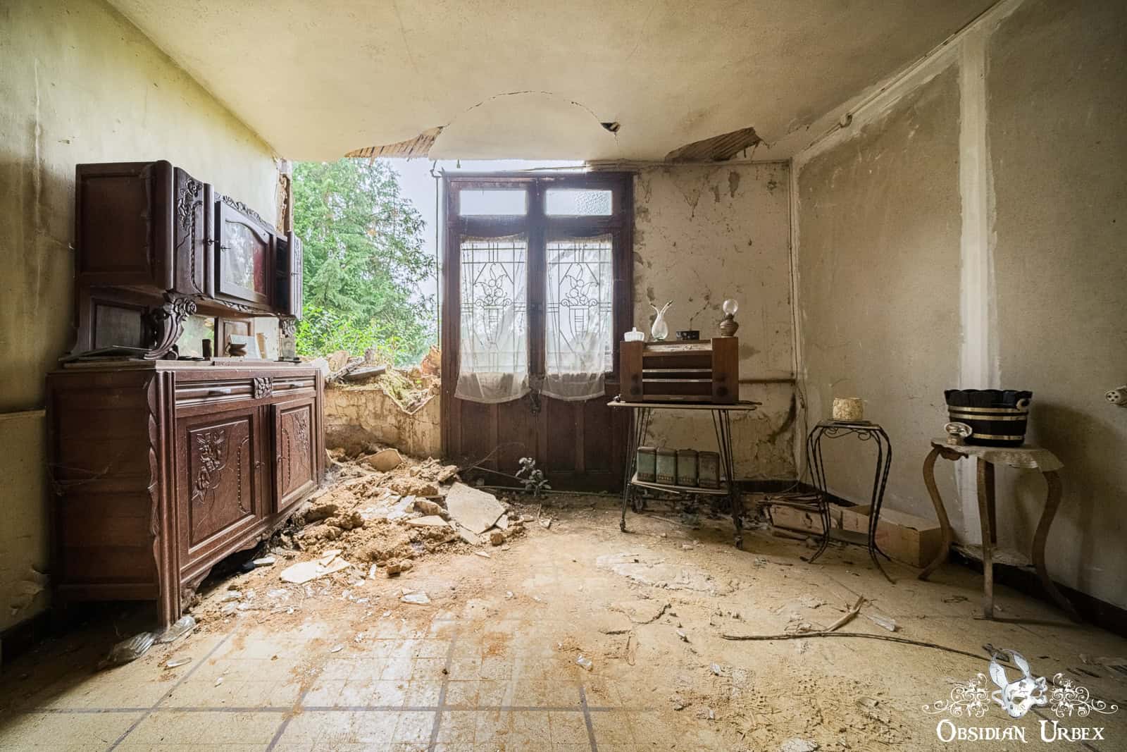 Sometimes, when I arrive at a location, finding a way inside is the first part of the adventure. Clearly, this time at Polly Pocket House, the path inside is obvious. I clambered over the fallen portion of the façade and entered the dining room. This room has a nice, heavy wooden table, with an interesting red velvet upholstered infant high-chair next to it. There are two smaller rooms with some furniture, one has a radio on a small table and the other has another dining table and a writing bureau.
