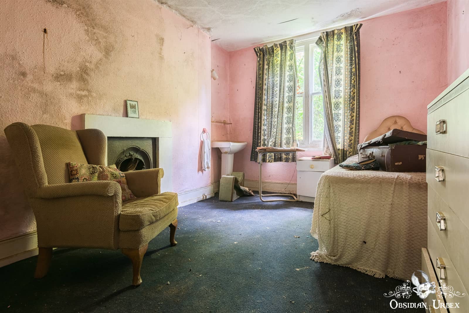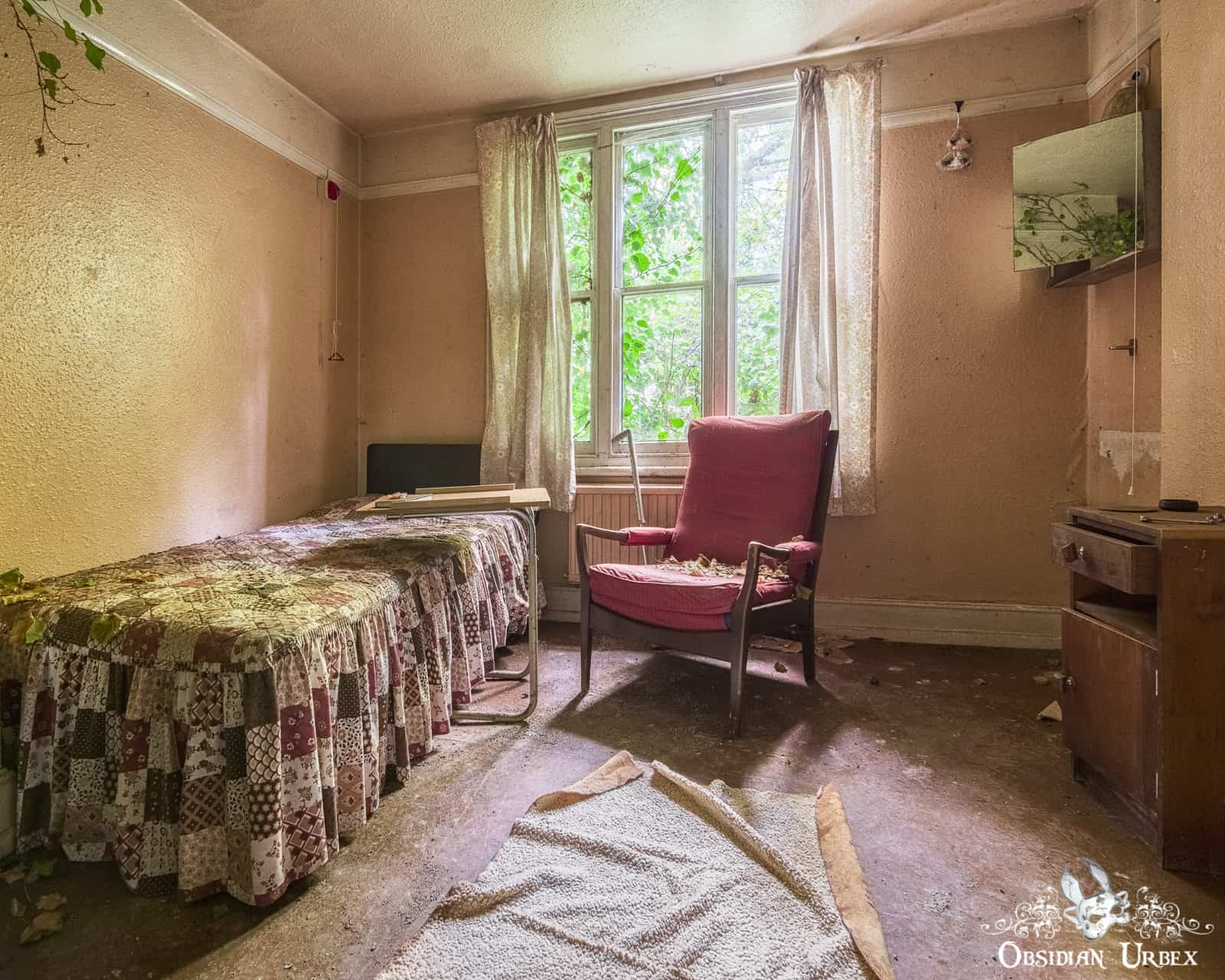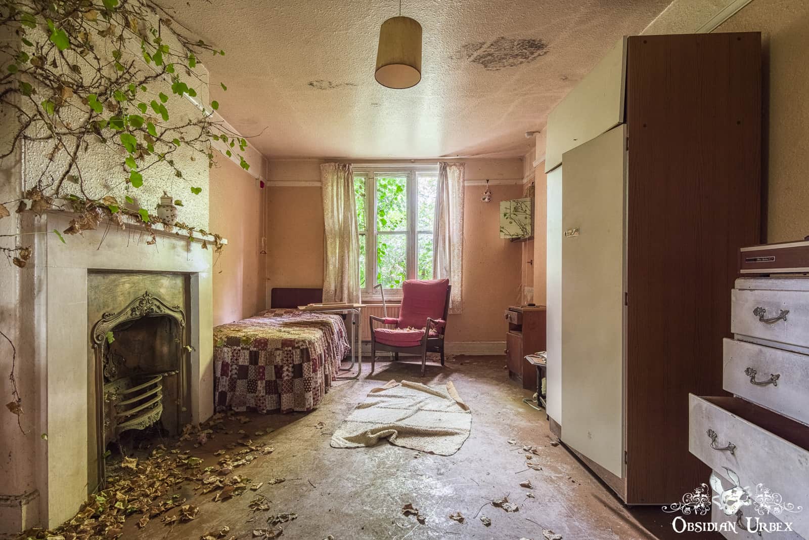 Downstairs, the walls and chairs of the day room lay encrusted with black mould. The floor is littered with plaster which has fallen from the crumbling ceiling. Upstairs there are small and simple bedrooms. Ivy encroaches and spreads across the chimney breast above a beautiful wrought iron fireplace.