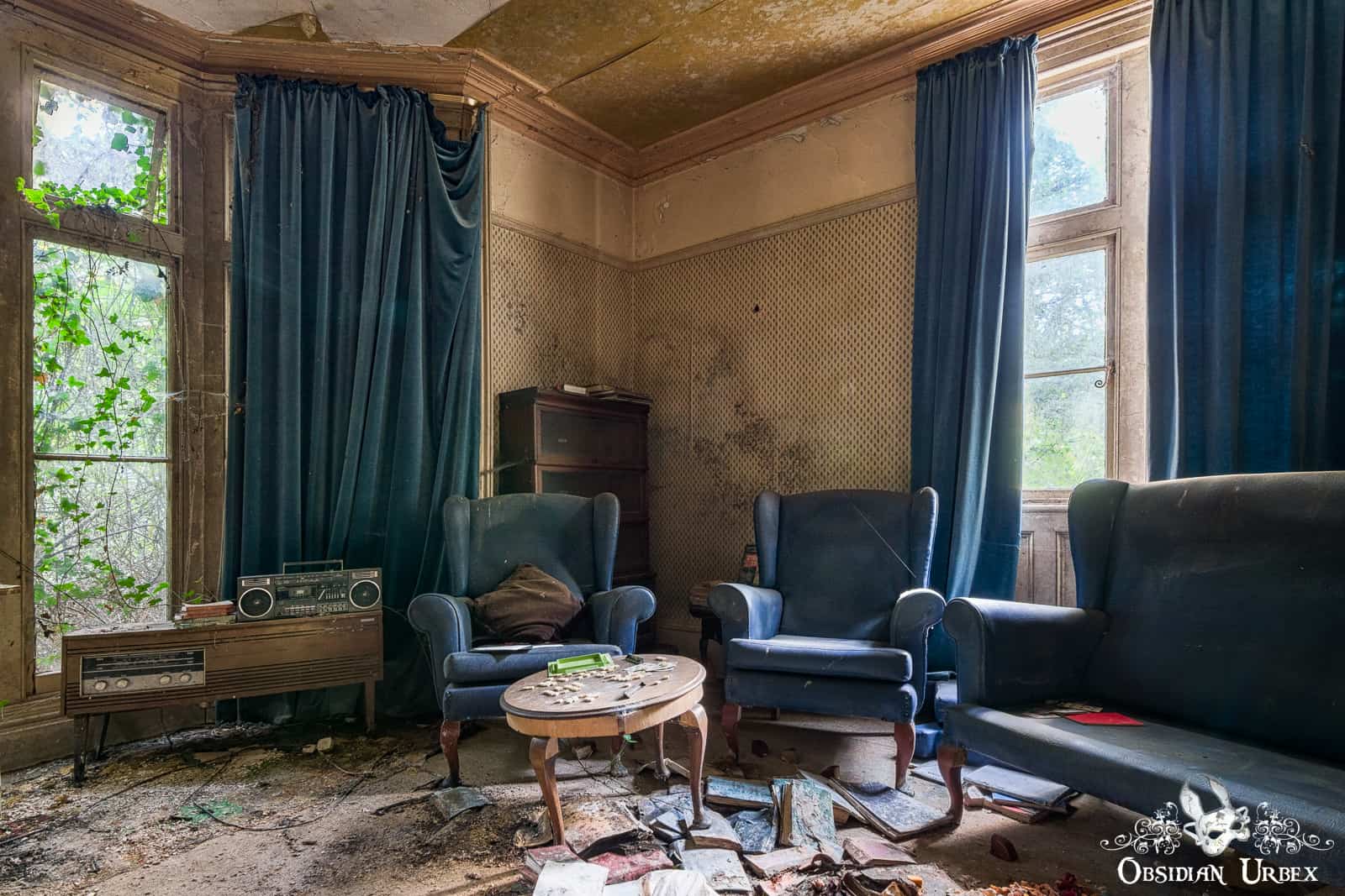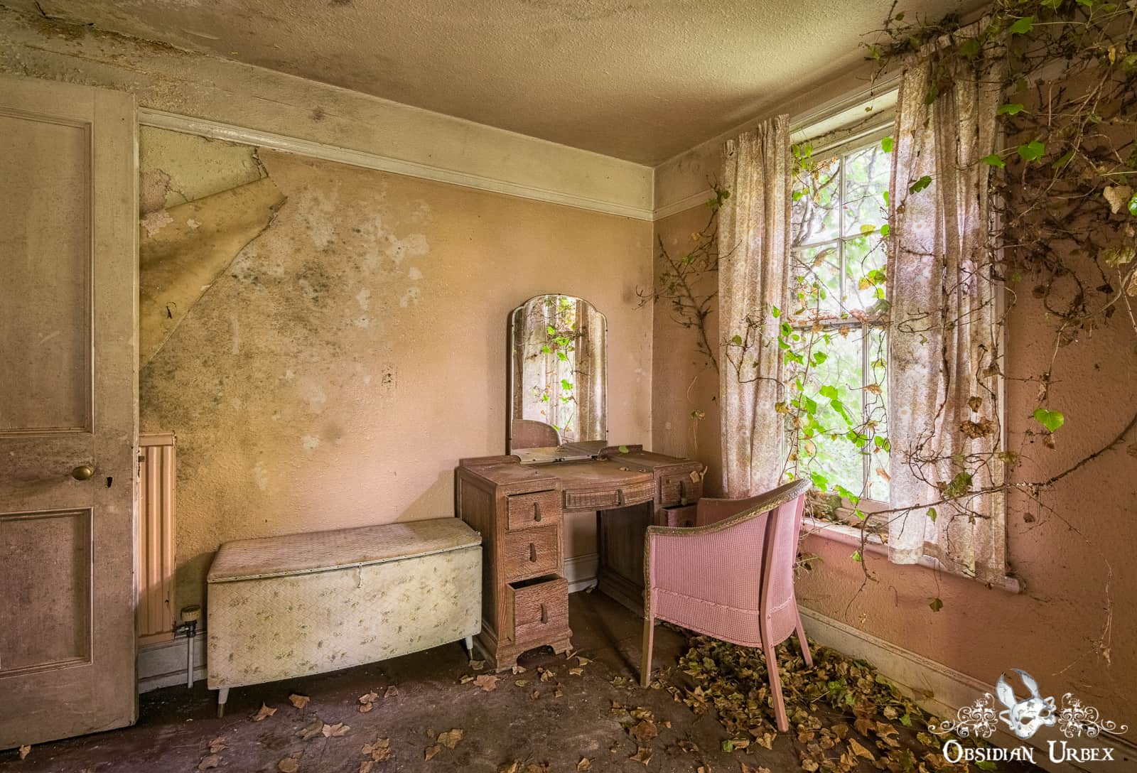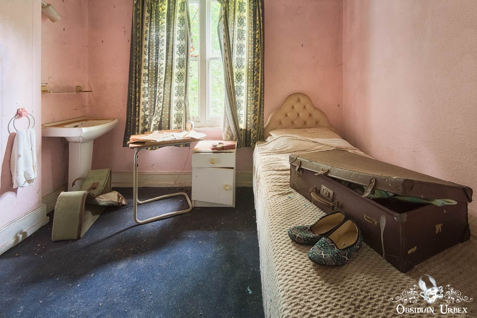 Downstairs, the walls and chairs of the day room lay encrusted with black mould. The floor is littered with plaster which has fallen from the crumbling ceiling. Upstairs there are small and simple bedrooms. Ivy encroaches and spreads across the chimney breast above a beautiful wrought iron fireplace.