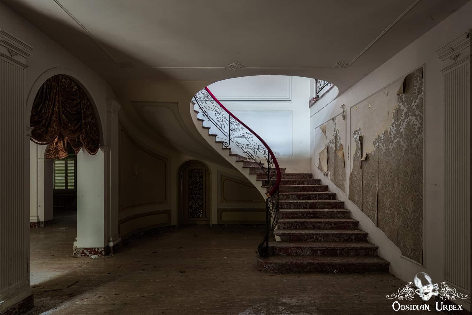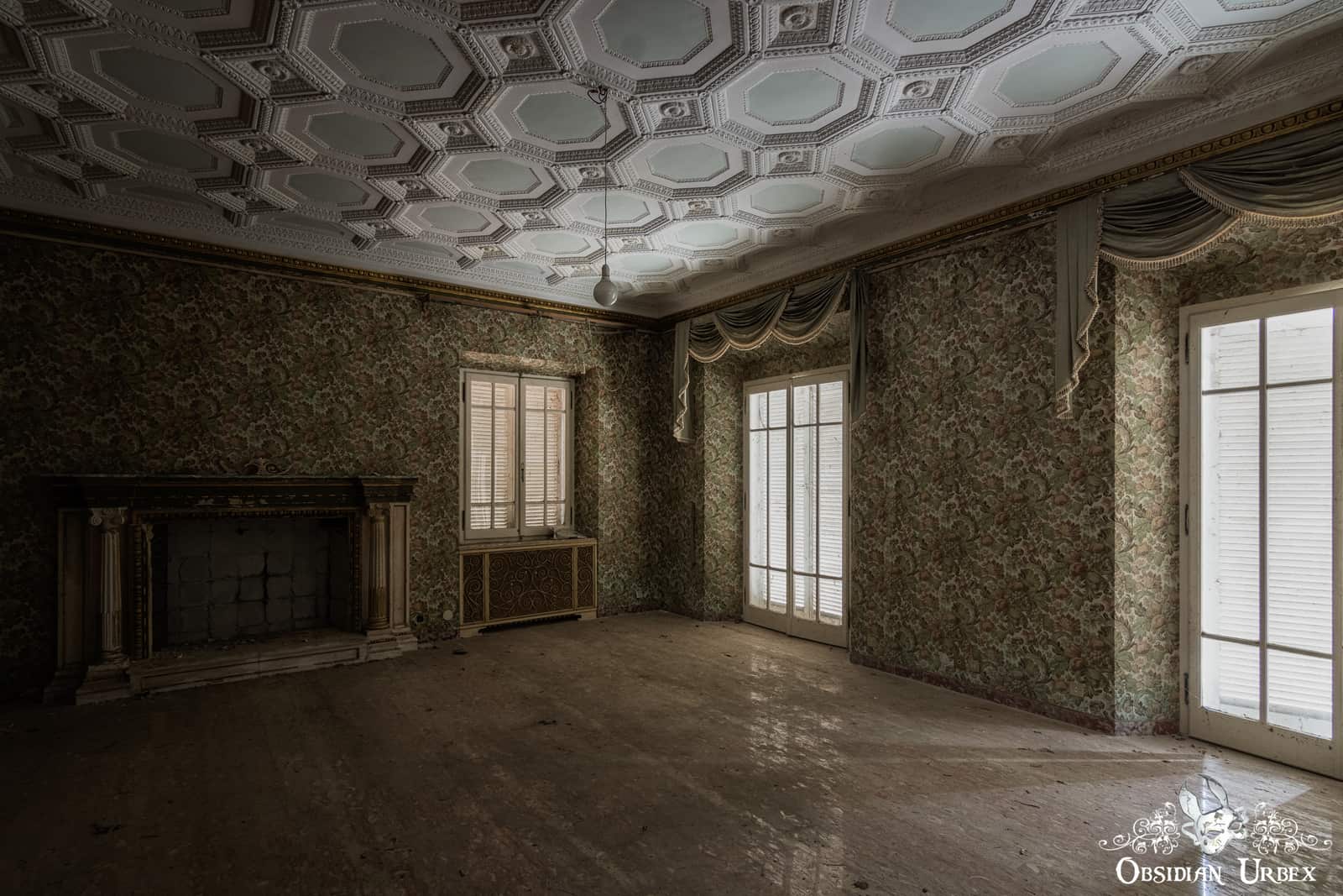 The outside of the house is relatively plain, and is painted white. In fact, this location is one of the more modern Italian villas which we visited on our journey. Around the back of Villa PDO / Villa Zombo is an overgrown empty swimming pool. Sadly, by the time of our visit the beautiful chandeliers had been stolen. Only one chandelier remained smashed on the ground floor. This is likely due to a clumsy attempt to remove it.