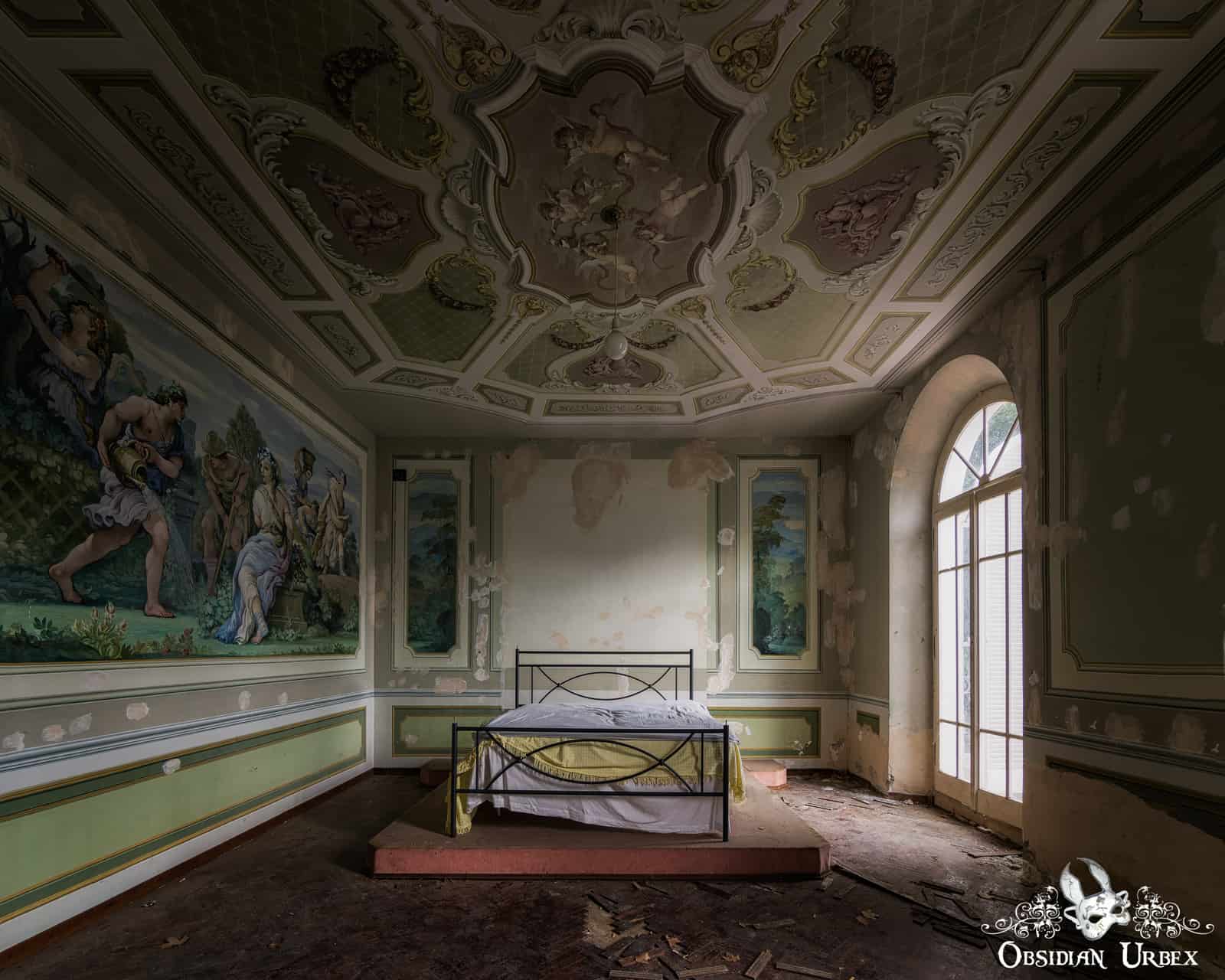 The master bedroom of Villa PDO is the only other feature of interest in this house. This oddly shaped room features painted walls and ceiling, reminiscent of the true classical Italian villas. The ceiling is painted with cherubs and floral-themed motifs. The walls feature scenes of Romanesque toga-gowned ladies relaxing around gardens and fountains, while men pour water from ornamental vases. These angelic relaxing Italians wear floral wreaths on their heads as they frolic in the lush gardens, seemingly living a carefree life of leisure.