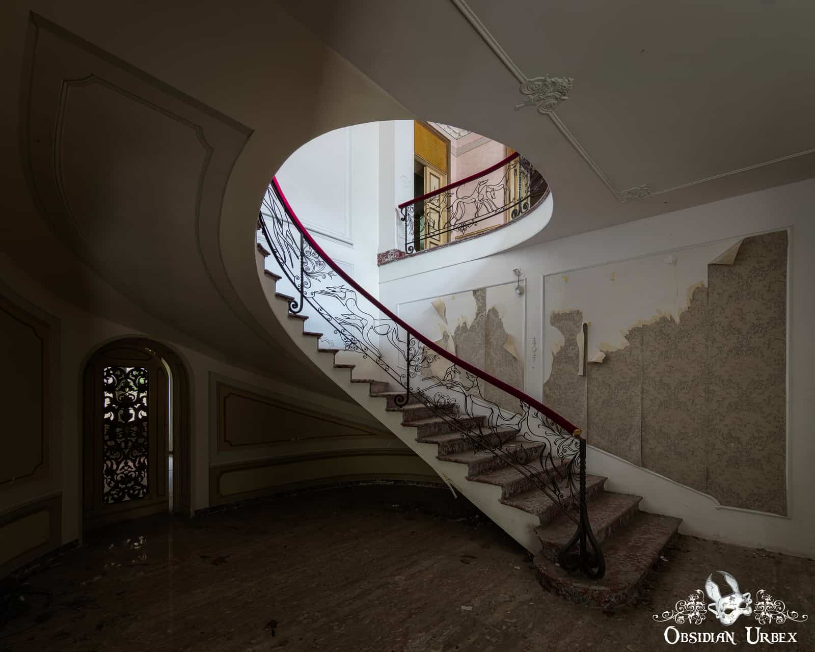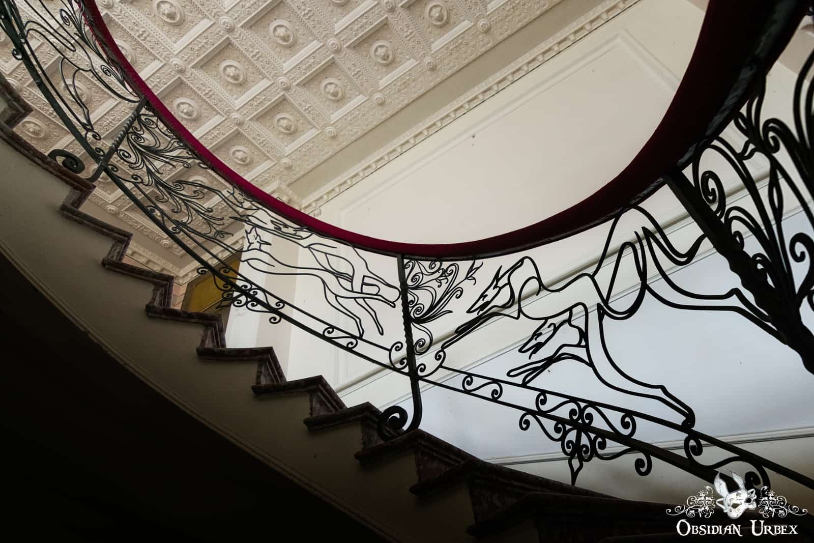 The spiral staircase is quite unusual, sporting a plus red velvet-covered handrail. This is supported by black metal uprights, featuring stylised greyhounds. The dogs appear to be leaping and bounding up the staircase towards their master’s bedrooms. It is said the owner of this Villa PDO / Villa Zombo was a dog breeder. This may offer an explanation for this unique staircase design.