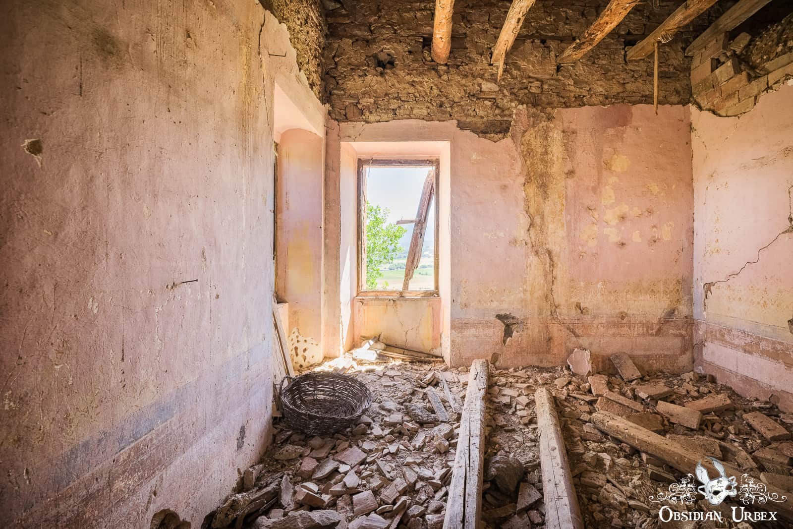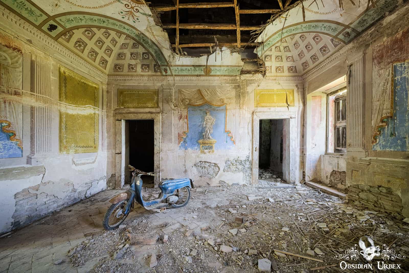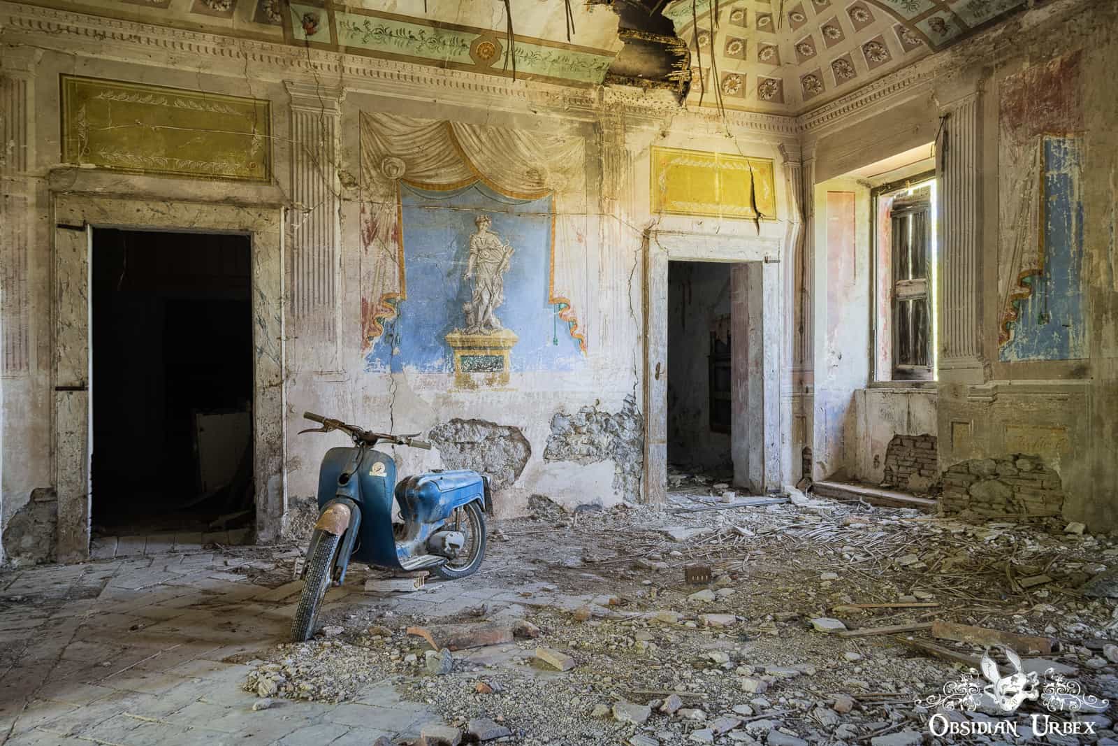Villa Vespa is a classic abandoned Italian location; simple but also beautiful. Interestingly the location is in fact quite small, being some time of barn or storage rooms. The villa next door has been renovated and appears to be lived in, with a freshly mowed lawn and well-tended garden. The area in these photographs is dilapidated, and the ceiling is collapsing. The walls and ceiling feature beautiful frescos. In the room is a blue scooter, which is a rather strange thing to find in a frescoed room. This room is wonderfully photogenic, a mixture of grandeur and decay acting as a fascinating backdrop to the vintage scooter.